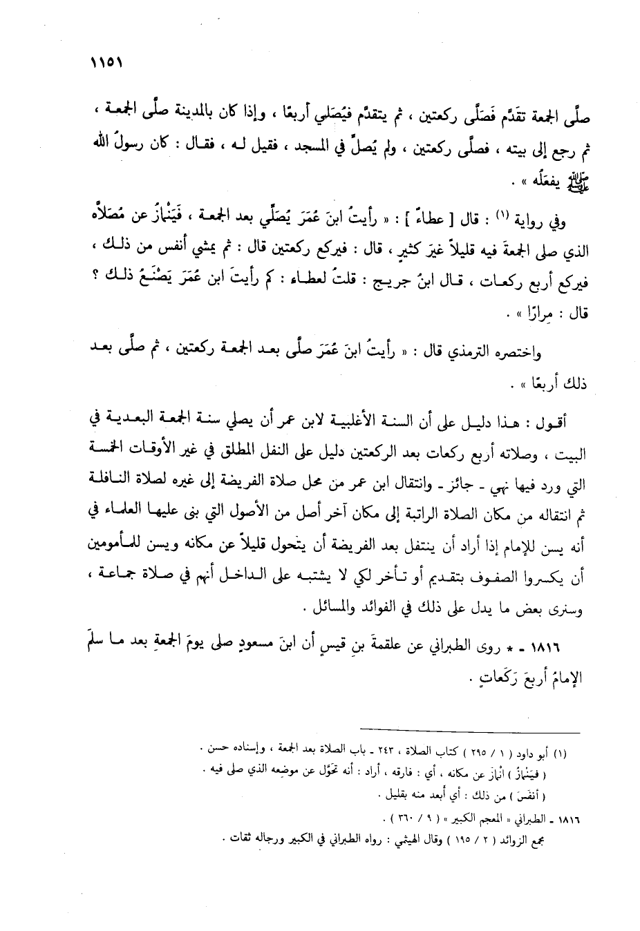 1816 - * روى الطبراني عن علقمة بن قيس أن ابن مسعود صلى يوم الجمعة بعد ما سلم الإمام أربع ركعات.