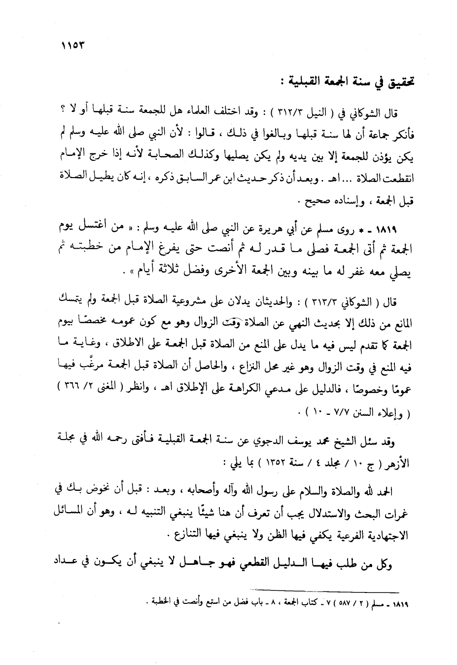 قال (الشوكاني 3/ 313): والحديثان يدلان على مشروعية الصلاة قبل الجمعة ولم يتمسك المانع من ذلك إلا بحديث النهي عن الصلاة وقت الزوال وهو مع كون عمومه مخصصاً بيوم الجمعة كما تقدم ليس فيه ما يدل على المنع من الصلاة قبل الجمعة على الإطلاق، وغاية ما فيه المنع في وقت الزوال وهو غير محل النزاع، والحاصل أن الصلاة قبل الجمعة مرغب فيها عموماً وخصوصاً، فالدليل على مدعي الكراهة على الإطلاق اهـ، وانظر (المغني 2/ 366) (وإعلاء السنن 7/ 7 - 10).