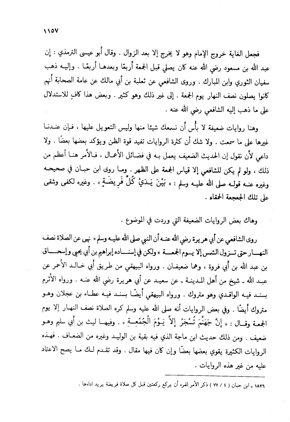 فجعل الغاية خروج الإمام وهو لا يخرج إلا بعد الزوال. وقال أبو عيسى الترمذي: إن عبد الله بن مسعود رضي الله عنه كان يصلي قبل الجمعة أربعاً وبعدها أربعاً. وإليه ذهب سفيان الثوري وابن المبارك. وروى الشافعي عن ثعلبة بن أبي مالك عن عامة الصحابة أنهم كانوا يصلون نصف النهار يوم الجمعة. إلى غير ذلك وهو كثير. وبعض هذا كاف للاستدلال على ما ذهب إليه الشافعي رضي الله عنه.
