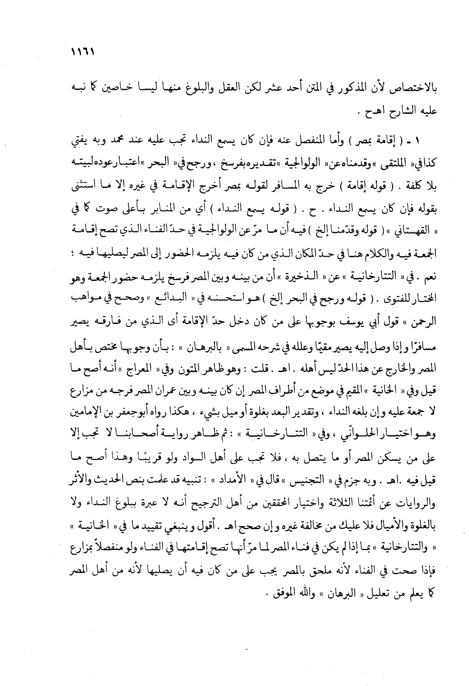 1 - (إقامة بمصر) وأما المنفصل عنه فإن كان يسمع النداء تجب عليه عند محمد وبه يفتي كذا في "الملتقى" وقدمناه عن "الولوالجية" تقديره بفرسخ، ورجح في "البحر" اعتبار عوده لبيته بلا كلفة. (قوله إقامة) خرج به المسافر لقوله بمصر أخرج الإقامة في غيره إلا ما استثنى بقوله فإن كان يسمع النداء. ح. (قوله يسمع النداء) أي من المنابر بأعلى صوت كما في "القهستاني" (قوله وقدّمنا إلخ) فيه أن ما مر عن الولوالجية في حد الفناء الذي تصح إقامة الجمعة فيه والكلام هنا في حد المكان الذي من كان فيه يلزمه الحضور إلى المصر ليصليها فيه؛ نعم. في "التتارخانية" عن "الذخيرة" أن من بينه وبين المصر فرسخ يلزمه حضور الجمعة وهو المختار للفتوى. (قوله ورجح في البحر إلخ) هو استحسنه في "البدائع" وصحح في مواهب الرحمن" قول أبي يوسف بوجوبها على من كان دخل حد الإقامة أي الذي من فارقه يصير مسافراً وإذا وصل إليه يصير مقيماً وعلله في شرحه المسمى "بالبرهان": بأن وجوبها مختص بأهل المصر والخارج عن هذا الحد ليس أهله. اهـ. قلت: وهو ظاهر المتون وفي "المعراج" أنه أصح ما قيل وفي "الخانية" المقيم في موضع من أطراف المصر إن كان بينه وبين عمران المصر فرجه من مزارع لا جمعة عليه وإن بلغه النداء، وتقدير البعد بغلوة أو ميل بشيء، هكذا رواه أبو جعفر بن الإمامين وهو اختيار الحلواني، وفي "التتارخانية": ثم ظاهر رواية أصحابنا لا تجب إلا على من يسكن المصر أو ما يتصل به، فلا تجب على أهل السواد ولو قريباً وهذا أصح ما قيل فيه. اهـ. وبه جزم في "التجنيس" قال في "الأمداد": تنبيه قد علمت بنص الحديث والأثر والروايات عن أئمتنا الثلاثة واختيار المحققين من أهل الترجيح أنه لا عبرة ببلوغ النداء ولا بالغلوة والأميال فلا عليك من مخالفة غيره وإن صحح اهـ. أقول وينبغي تقييد ما في "الخانية" "والتتارخانية" بما إذا لم يكن في فناء المصر لما مر أنها تصح إقامتها في الفناء ولو منفصلاً بمزارع فإذا صحت في الفناء لأنه ملحق بالمصر يجب على من كان فيه أن يصليها لأنه من أهل المصر كما يعلم من تعليل "البرهان" والله الموفق.