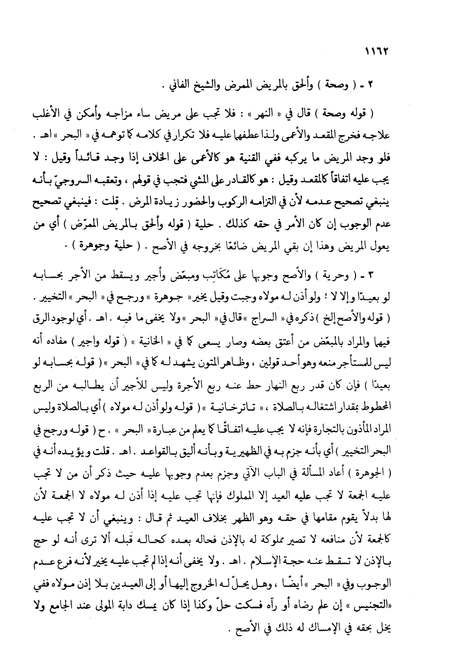 3 - (وحرية) والأصح وجوبها على مكاتب ومبعض وأجير ويسقط من الأجر بحسابه لو بعيداً وإلا لا؛ ولو أذن له مولاه وجبت وقيل يخير "جوهرة" ورجح في "البحر" التخيير. (قوله والأصح إلخ) ذكره في "السراج" قال في "البحر" ولا يخفى ما فيه. اهـ. أي لوجود الرق فيهما والمراد بالمبعض من أعتق بعضه وصار يسعى كما في "الخانية" (قوله واجير) مفاده أنه ليس للمستأجر منعه وهو أحد قولين، وظاهر المتون يشهد له كما في "البحر" (قوله بحسابه لو بعيداً) فإن كان قدر ربع النهار حط عنه ربع الأجرة وليس للأجير أن يطالبه من الربع المحطوط بمقدار اشتغاله بالصلاة، "تاترخانية" (قوله ولو أذن له مولاه) أي بالصلاة وليس المراد المأذون بالتجارة فإنه لا يجب عليه اتفاقاً كما يعلم من عبارة "البحر". ح (قوله ورجح في البحر التخيير) أي بأنه جزم به في الظهيرية وبأنه أليق بالقواعد. اهـ. قلت ويؤيده أنه في (الجوهرة) أعاد المسألة في الباب الآتي وجزم بعدم وجوبها عليه حيث ذكر أن من لا تجب عليه الجمعة لا تجب عليه العيد إلا المملوك فإنها تجب عليه إذا أذن له مولاه لا الجمعة لأن لها بدلاً يقوم مقامها في حقه وهو الظهر بخلاف العيد ثم قال: وينبغي أن لا تجب عليه كالجمعة لأن منافعه لا تصير مملوكة له بالإذن فحاله بعده كحاله قبله ألا ترى أنه لو حج بالإذن لا تسقط عنه حجة الإسلام. اهـ. ولا يخفى أنه إذا لم تجب عليه يخير لأنه فرع عدم الوجوب وفي "البحر" أيضاً، وهل يحل له الخروج إليها أو إلى العيدين بلا إذن مولاه ففي "التجنيس" إن علم رضاه أو رآه فسكت حل وكذا إذا كان يمسك دابة المولى عند الجامع ولا يخل بحقه في الإمساك له ذلك في الأصح.