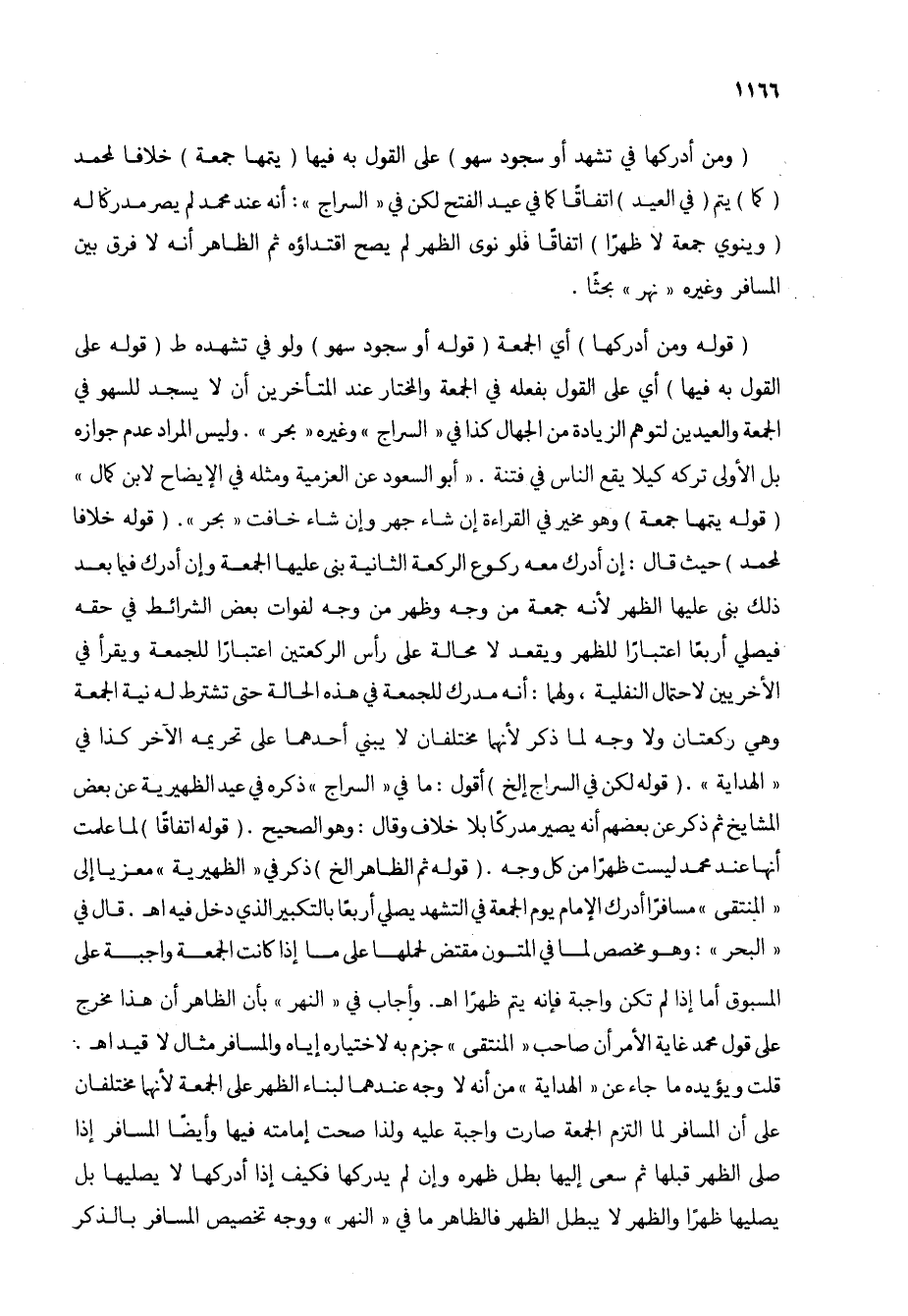 (ومن أدركها في تشهد أو سجود سهو) على القول به فيها (يتمها جمعة) خلافاً لمحمد (كما) يتم (في العيد) اتفاقاً كما في عيد الفتح لكن في "السراج": أنه عند محمد لم يصر مدركاً له (وينوي جمعة لا ظهراً) اتفاقاً فلو نوى الظهر لم يصح اقتداؤه ثم الظاهر أنه لا فرق بين المسافر وغيره "نهر" بحثاً.