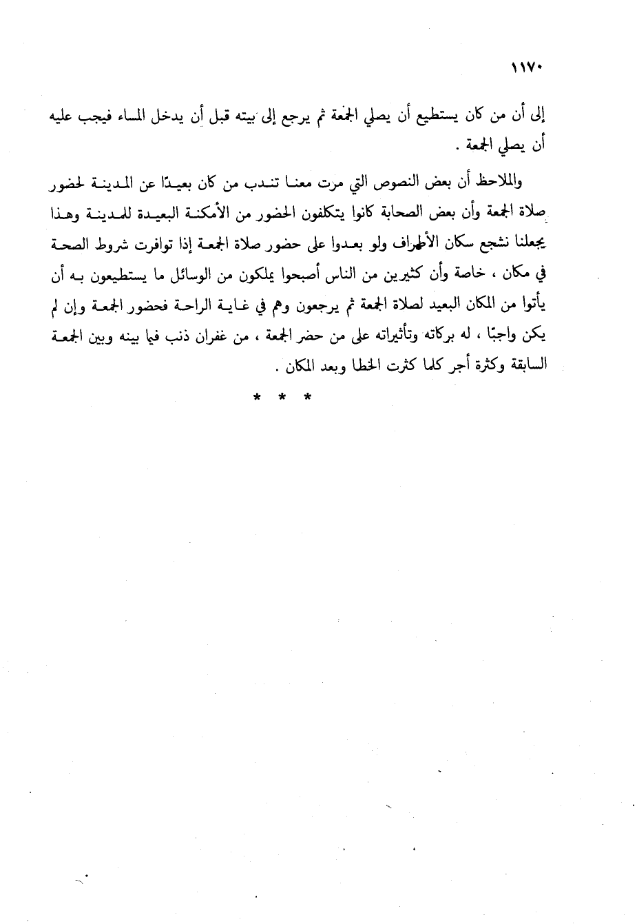 والملاحظ أن بعض النصوص التي مرت معنا تندب من كان بعيداً عن المدينة لحضور صلاة الجمعة وأن بعض الصحابة كانوا يتكلفون الحضور من الأمكنة البعيدة للمدينة وهذا يجعلنا نشجع سكان الأطراف ولو بعدوا على حضور صلاة الجمعة إذا توافرت شروط الصحة في مكان، خاصة وأن كثيرين من الناس أصبحوا يملكون من الوسائل ما يستطيعون به أن يأتوا من المكان البعيد لصلاة الجمعة ثم يرجعون وهم في غاية الراحة فحضور الجمعة وإن لم يكن واجباً، له بركاته وتأثيراته على من حضر الجمعة، من غفران ذنب فيما بينه وبين الجمعة السابقة وكثرة أجر كلما كثرت الخطا وبعد المكان.
