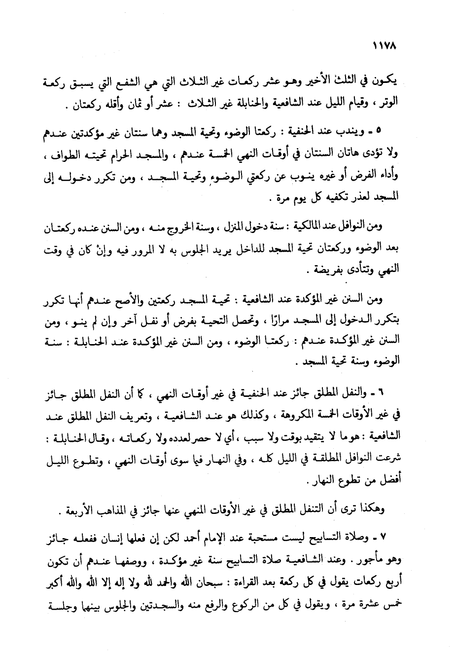 6 - والنفل المطلق جائز عند الحنفية في غير أوقات النهي، كما أن النفل المطلق جائز في غير الأوقات الخمسة المكروهة، وكذلك هو عند الشافعية، وتعريف النفل المطلق عند الشافعية: هو ما لا يتقيد بوقت ولا سبب، أي لا حصر لعدده ولا ركعاته، وقال الحنابلة: شرعت النوافل المطلقة في الليل كله، وفي النهار فيما سوى أوقات النهي، وتطوع الليل أفضل من تطوع النهار.