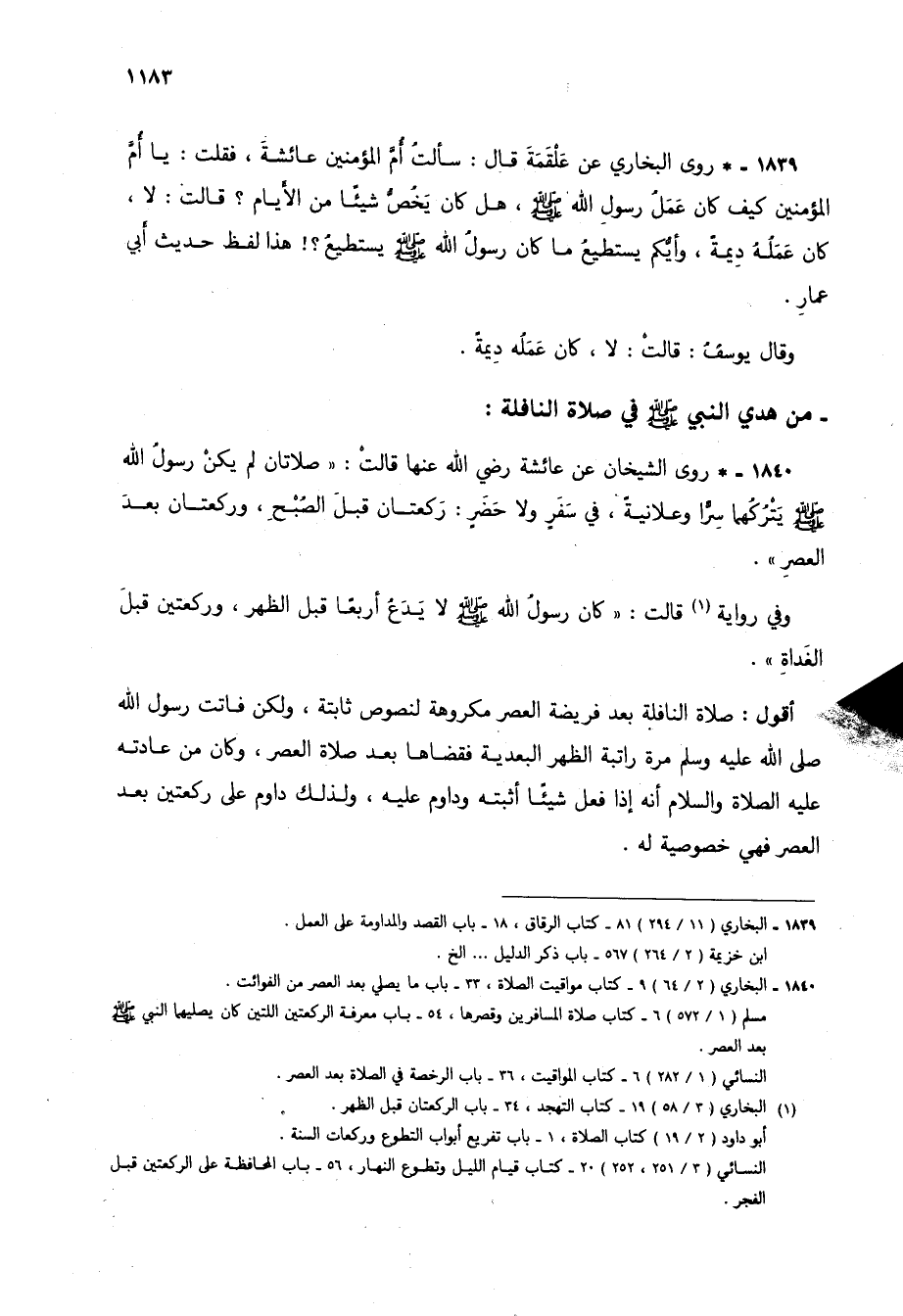 1840 - * روى الشيخان عن عائشة رضي الله عنها قالت: "صلاتان لم يكن رسول الله صلى الله عليه وسلم يتركهما سراً وعلانية، في سفر ولا حضر: ركعتان قبل الصبح، وركعتان بعد العصر".