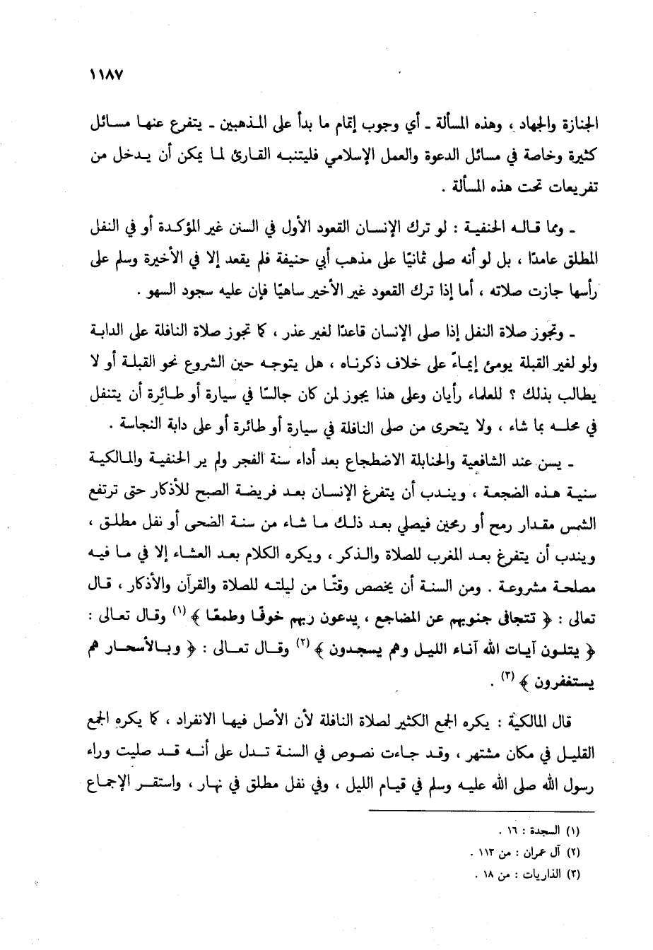 - يسن عند الشافعية والحنابلة الاضطجاع بعد أداء سنة الفجر ولم ير الحنفية والمالكية سنية هذه الضجعة، ويندب أن يتفرغ الإنسان بعد فريضة الصبح للأذكار حتى ترتفع الشمس مقدار رمح أو رمحين فيصلي بعد ذلك ما شاء من سنة الضحى أو نفل مطلق، ويندب أني تفرغ بعد المغرب للصلاة والذكر، ويكره الكلام بعد العشاء إلا في ما فيه مصلحة مشروعة. ومن السنة أن يخصص وقتاً من ليلته للصلاة والقرآن والأذكار، قال تعالى: {تَتَجَافَى جُنُوبُهُمْ عَنِ الْمَضَاجِعِ يَدْعُونَ رَبَّهُمْ خَوْفًا وَطَمَعًا} (1) وقال تعالى: {يَتْلُونَ آيَاتِ اللَّهِ آنَاءَ اللَّيْلِ وَهُمْ يَسْجُدُونَ} (2) وقال تعالى: {وَبِالْأَسْحَارِ هُمْ يَسْتَغْفِرُونَ} (3).