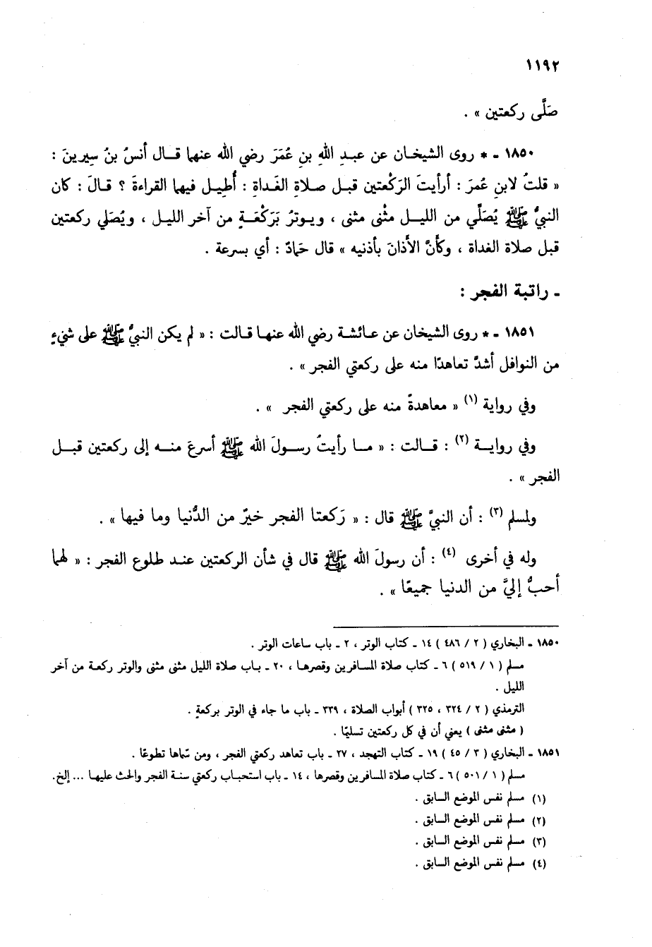 1850 - * روى الشيخان عن عبد الله بن عمر رضي الله عنهما قال أنس بن سيرين: "قلت لابن عمر: أرأيت الركعتين قبل صلاة الغداة: أطيل فيهما القراءة؟ قال: كان النبي صلى الله عليه وسلم يصلي من الليل مثنى مثنى، ويوتر بركعة من آخر الليل، ويصلي ركعتين قبل صلاة الغداة، وكأن الأذان بأذنيه" قال حماد: أي بسرعة.