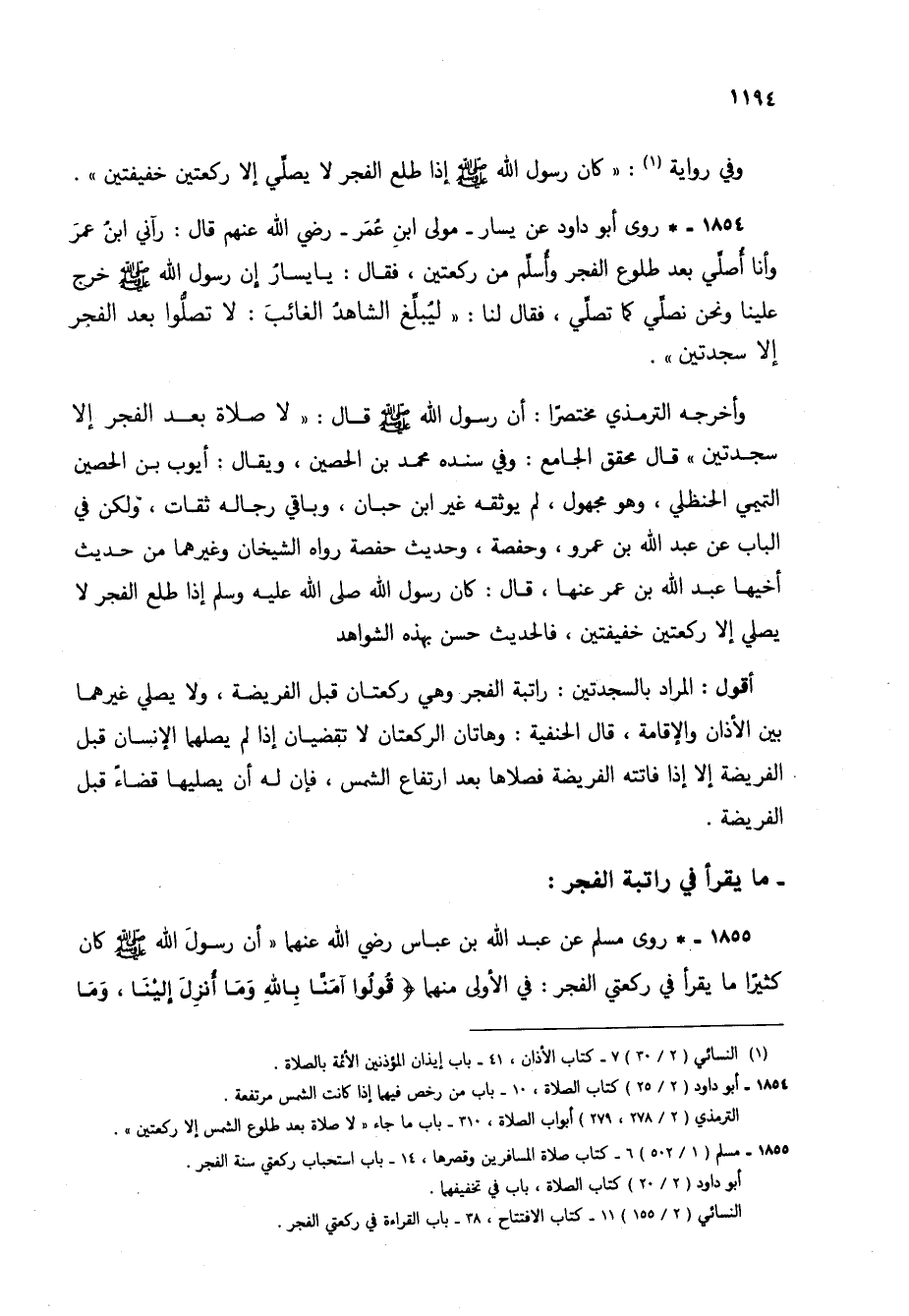 1854 - * روى أبو داود عن يسار- مولى ابن عمر- رضي الله عنهم قال: رآني ابن عمر وأنا أصلي بعد طلوع الفجر وأسلم من ركعتين، فقال: يا يسار إن رسول الله صلى الله عليه وسلم خرج علينا ونحن نصلي كما تصلي، فقال لنا: "ليبلغ الشاهد الغائب: لا تصلوا بعد الفجر إلا سجدتين".