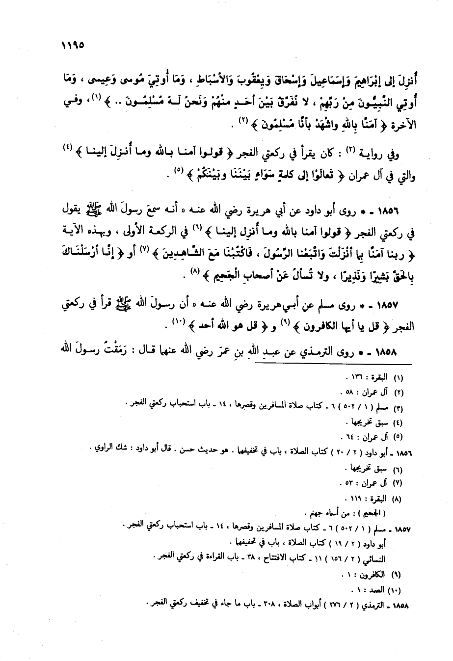 1856 - * روى أبو داود عن أبي هريرة رضي الله عنه "أنه سمع رسول الله صلى الله عليه وسلم يقول في ركعتي الفجر {قُولُوا آمَنَّا بِاللَّهِ وَمَا أُنْزِلَ إِلَيْنَا} (6) في الركعة الأولى، وبهذه الآية {رَبَّنَا آمَنَّا بِمَا أَنْزَلْتَ وَاتَّبَعْنَا الرَّسُولَ، فَاكْتُبْنَا مَعَ الشَّاهِدِينَ} (7) أو {إِنَّا أَرْسَلْنَاكَ بِالْحَقِّ بَشِيرًا وَنَذِيرًا، وَلَا تُسْأَلُ عَنْ أَصْحَابِ الْجَحِيمِ} (8).