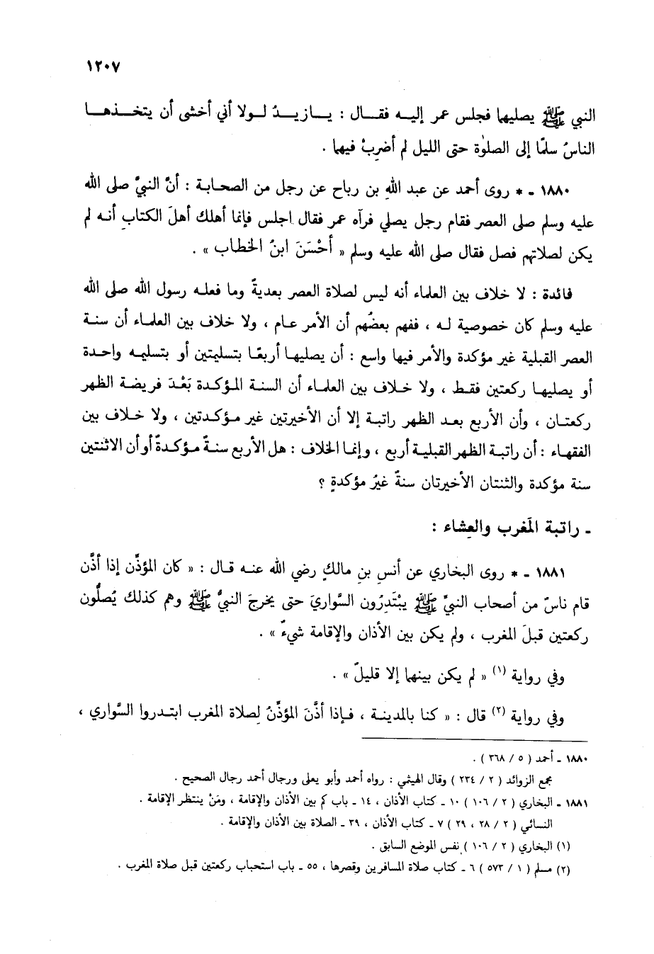 1881 - * روى البخاري عن أنس بن مالك رضي الله عنه قال: "كان المؤذن إذا أذن قام ناس من أصحاب النبي صلى الله عليه وسلم يبتدرون السواري حتى يخرج النبي صلى الله عليه وسلم وهم كذلك يصلون ركعتين قبل المغرب، ولم يكن بين الأذان والإقامة شيء".