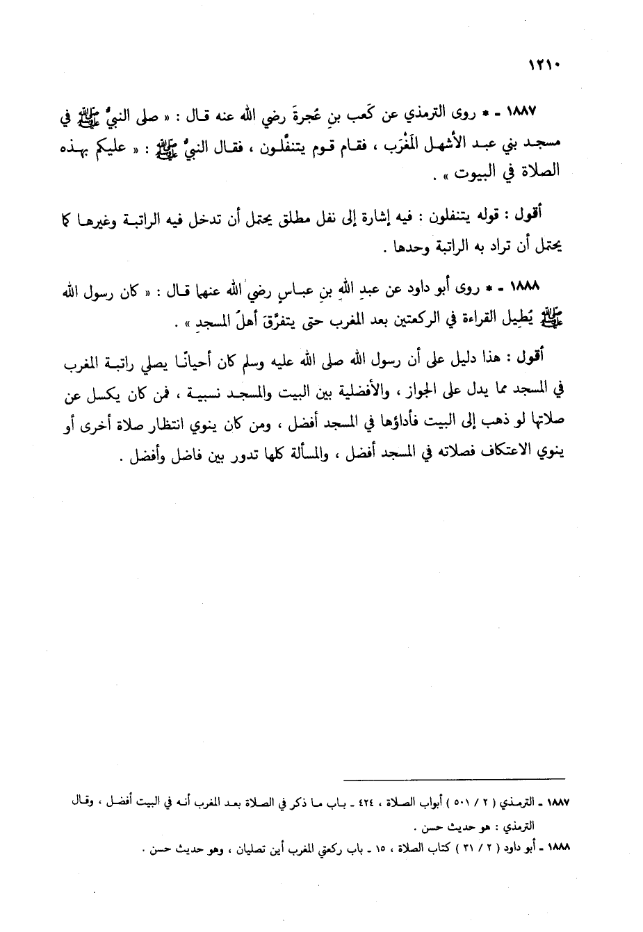 1887 - * روى الترمذي عن كعب بن عجرة رضي الله عنه قال: "صلى النبي صلى الله عليه وسلم في مسجد بني عبد الأشهل المغرب، فقام قوم يتنفلون، فقال النبي صلى الله عليه وسلم: "عليكم بهذه الصلاة في البيوت".