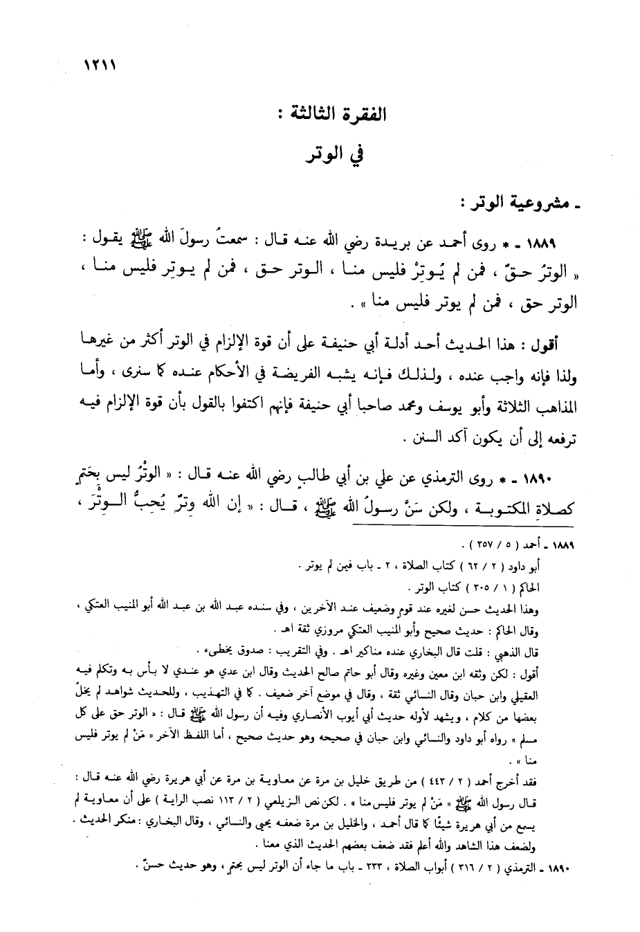 1889 - * روى أحمد عن بريدة رضي الله عنه قال: سمعت رسول الله صلى الله عليه وسلم يقول: "الوتر حق، فمن لم يوتر فليس منا، الوتر حق، فمن لم يوتر فليس منا، الوتر حق، فمن لم يوتر فليس منا".