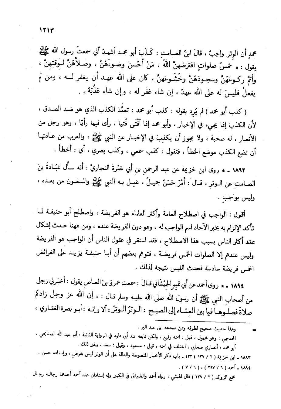 1893 - * روى ابن خزيمة عن عبد الرحمن بن أبي عمرة النجاري: أنه سأل عبادة بن الصامت عن الوتر، قال: أمر حسن جميل، عمل به النبي صلى الله عليه وسلم والمسلمون من بعده، وليس بواجب.