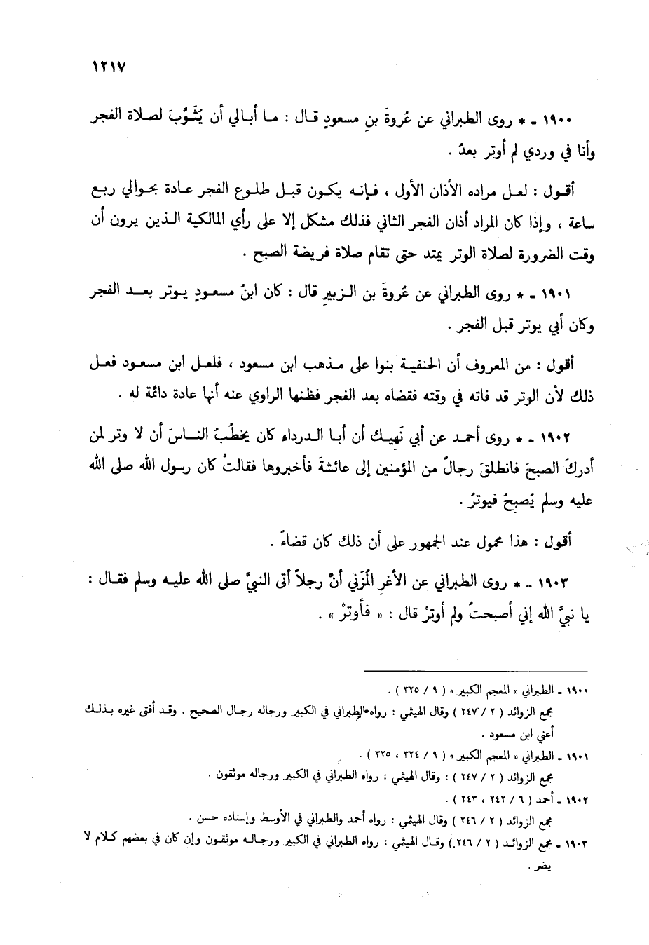 1901 - * روى الطبراني عن عروة بن الزبير قال: كان ابن مسعود يوتر بعد الفجر وكان أبي يوتر قبل الفجر.