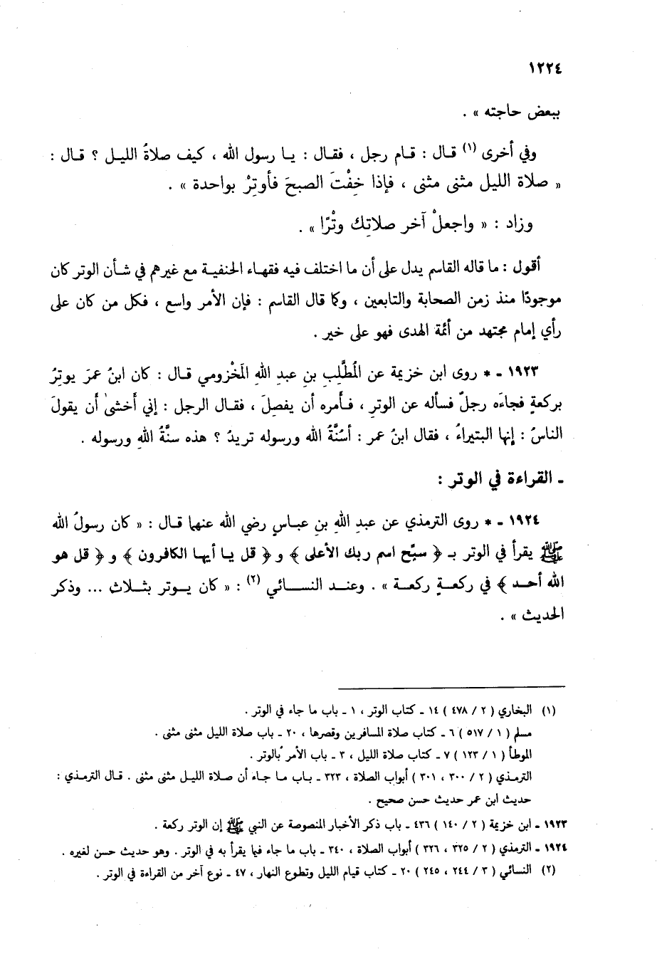 1924 - * روى الترمذي عن عبد الله بن عباس رضي الله عنهما قال: "كان رسول الله صلى الله عليه وسلم يقرأ في الوتر بـ (سبح اسم ربك الأعلى) و (قل يا أيها الكافرون) و (قل هو الله أحد) في ركعة ركعة". وعند النسائي (2): "كان يوتر بثلاث ... وذكر الحديث".
