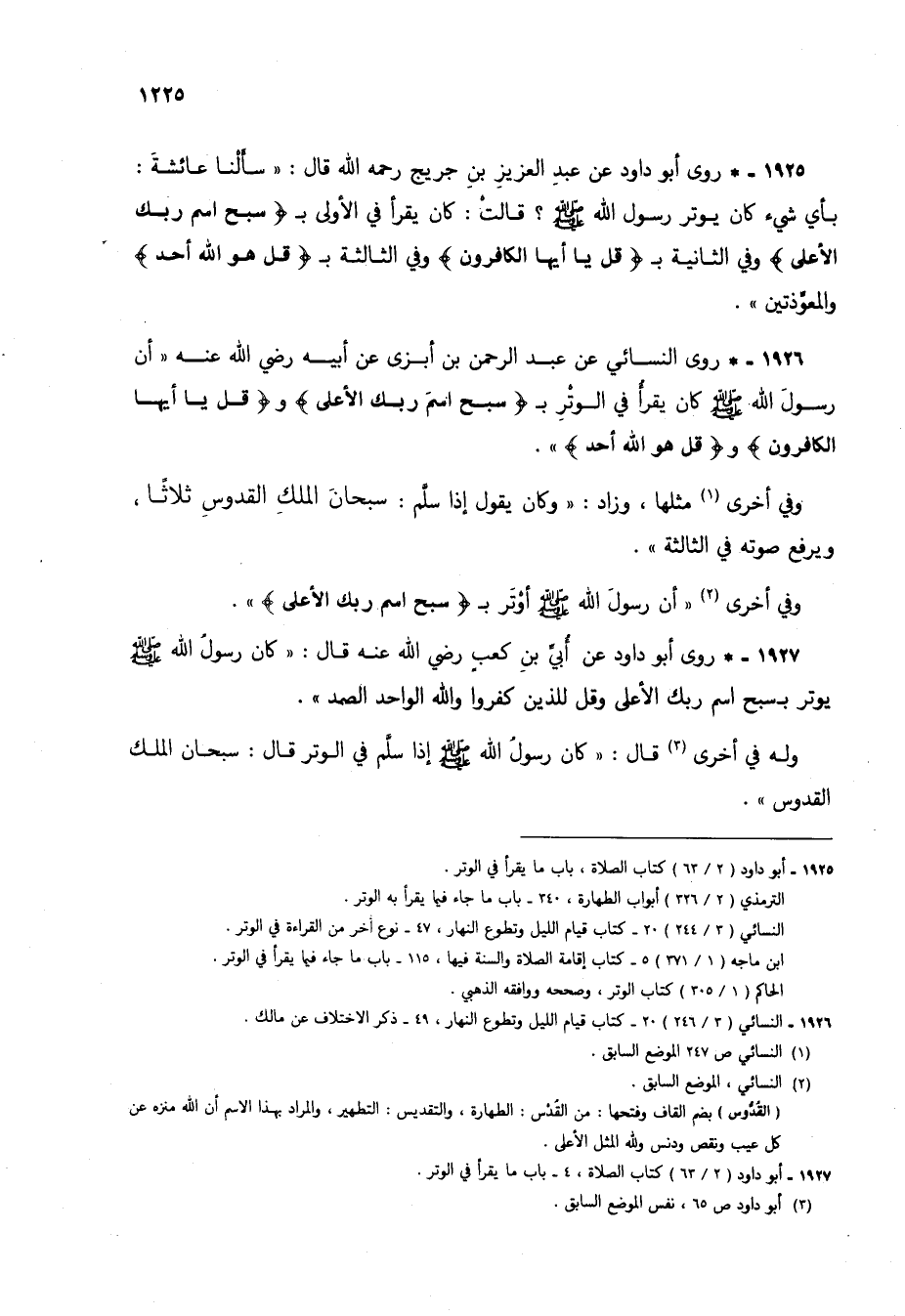 1926 - * روى النسائي عن عبد الرحمن بن أبزى عن أبيه رضي الله عنه "أن رسول الله صلى الله عليه وسلم كان يقرأ في الوتر بـ {سَبِّحِ اسْمَ رَبِّكَ الْأَعْلَى} و {قُلْ يَاأَيُّهَا الْكَافِرُونَ} و {قُلْ هُوَ اللَّهُ أَحَدٌ} ".