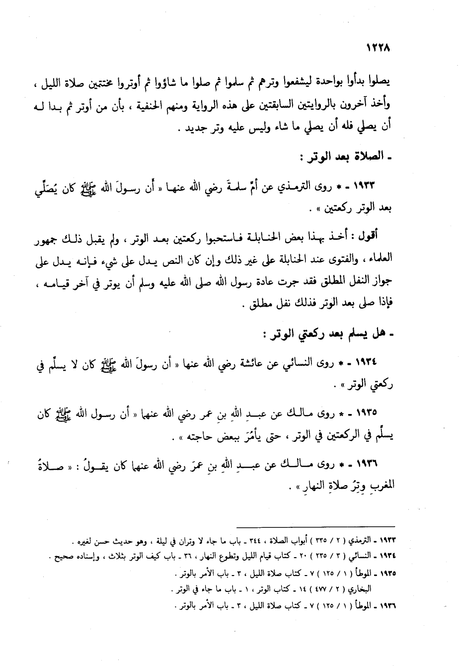1935 - * روى مالك عن عبد الله بن عمر رضي الله عنهما "أن رسول الله صلى الله عليه وسلم كان يسلم في الركعتين في الوتر، حتى يأمر ببعض حاجته".