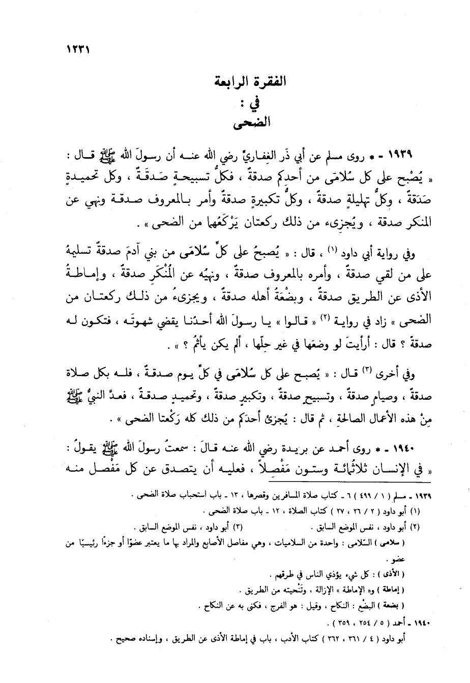 1939 - * روى مسلم عن أبي ذر الغفاري رضي الله عنه أن رسول الله صلى الله عليه وسلم قال: "يصبح على كل سلامى من أحدكم صدقة، فكل تسبيحة صدقة، وكل تحميدة صدقة، وكل تهليلة صدقة، وكل تكبيرة صدقة وأمر بالمعروف صدقة ونهي عن المنكر صدقة، ويجزئ من ذلك ركعتان يركعهما من الضحى".
