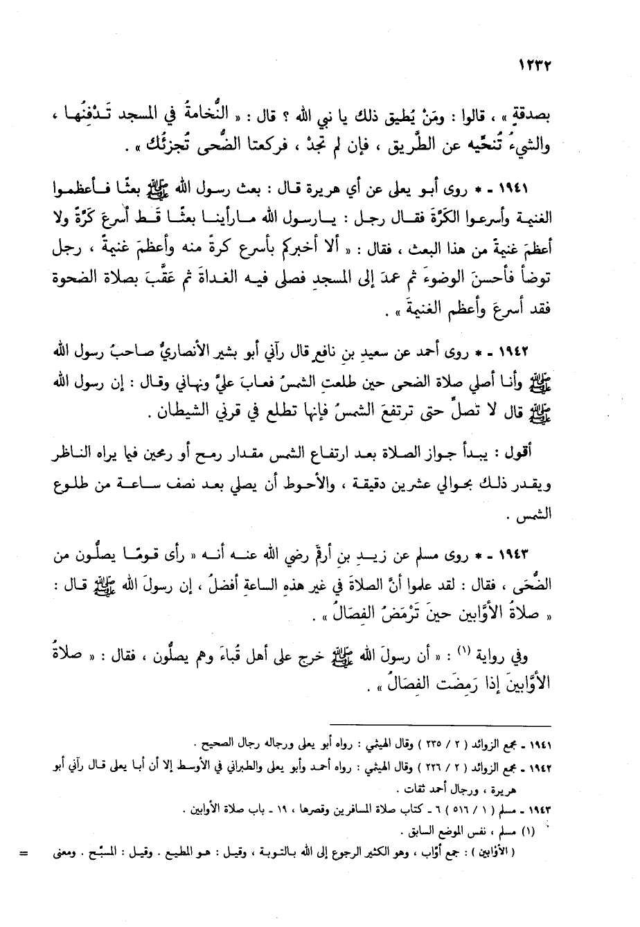 1943 - * روى مسلم عن زيد بن أرقم رضي الله عنه أنه "رأى قوماً يصلون من الضحى، فقال: لقد علموا أن الصلاة في غير هذه الساعة أفضل، إن رسول الله صلى الله عليه وسلم قال: "صلاة الأوابين حين ترمض الفصال".