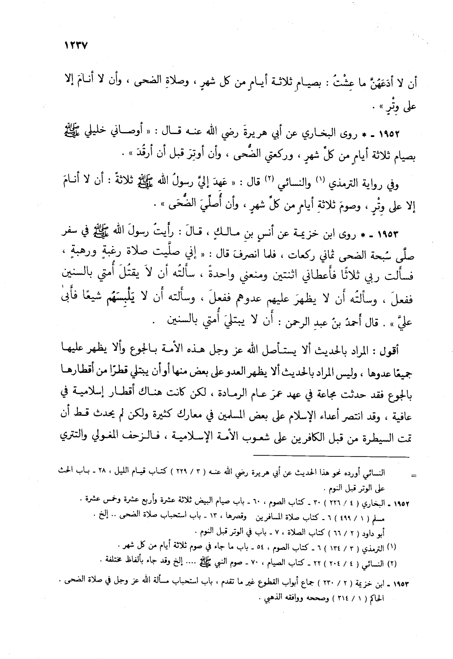 1953 - * روى ابن خزيمة عن أنس بن مالك، قال: رأيت رسول الله صلى الله عليه وسلم في سفر صلى سبحة الضحى ثماني ركعات، فلما انصرف قال: "إني صليت صلاة رغبة ورهبة، فسالت ربي ثلاثاً فأعطاني اثنتين ومنعني واحدة، سألته أن لا يقتل أمتي بالسنين ففعل، وسألته أن لا يظهر عليهم عدوهم ففعل، وسألته أن لا يلبسهم شيعاً فأبى علي". قال أحمد بن عبد الرحمن: أن لا يبتلي أمتي بالسنين.