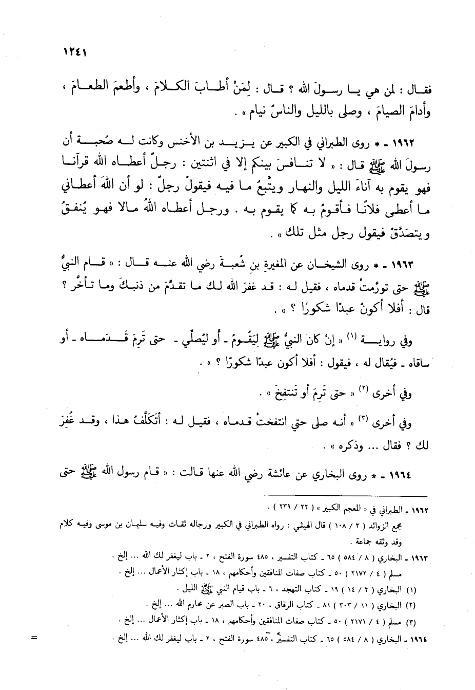 1963 - * روى الشيخان عن المغيرة بن شعبة رضي الله عنه قال: "قام النبي صلى الله عليه وسلم حتى تورمت قدماه، فقيل له: قد غفر الله لك ما تقدم من ذنبك وما تأخر؟ قال: أفلا أكون عبداً شكوراً؟ ".