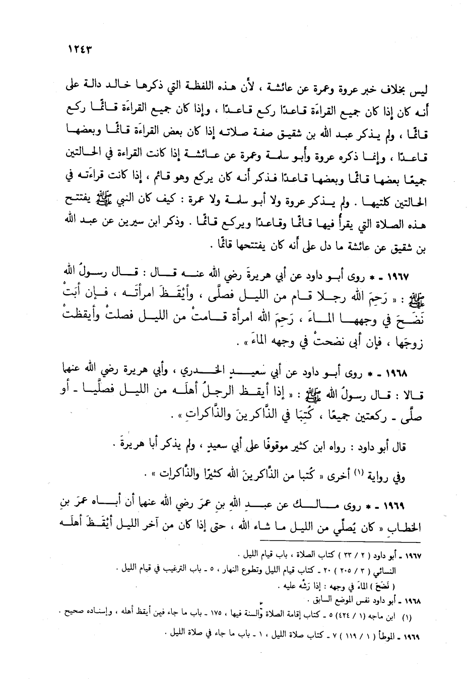 1967 - * روى أبو داود عن أبي هريرة رضي الله عنه قال: قال رسول الله صلى الله عليه وسلم: "رحم الله رجلاً قام من الليل فصلى، وأيقظ امرأته، فإن أبت نضح في وجهها الماء، رحم الله امرأة قامت من الليل فصلت وأيقظت زوجها، فإن أبى نضحت في وجهه الماء".