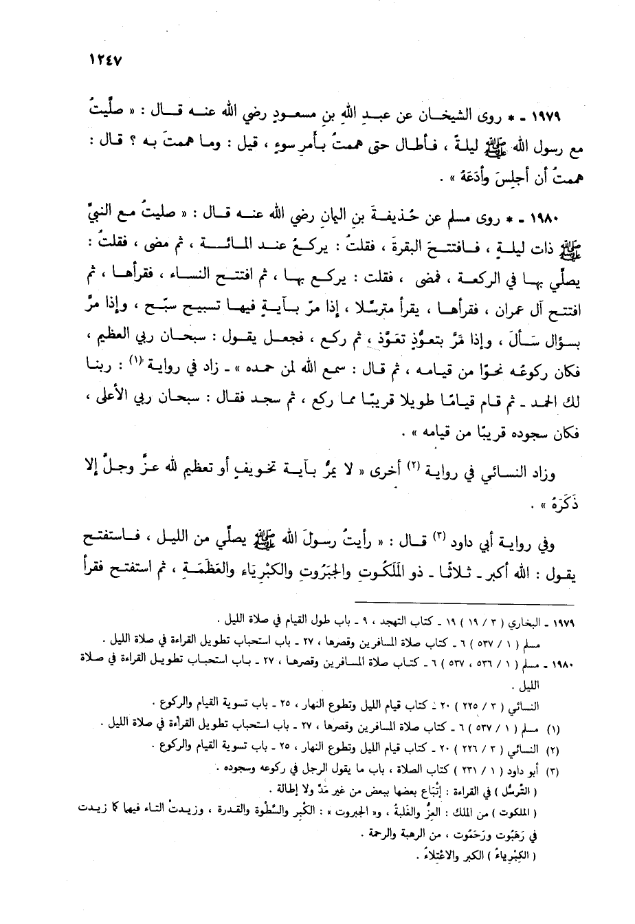 1980 - * روى مسلم عن حذيفة بن اليمان رضي الله عنه قال: "صليت مع النبي صلى الله عليه وسلم ذات ليلة، فافتتح البقرة، فقلت: يركع عند المائة، ثم مضى، فقلت: يصلي بها في الركعة، فمضى، فقلت: يركع بها، ثم افتتح النساء، فقرأها، ثم افتتح آل عمران، فقرأها، يقرأ مترسلاً، إذا مر بآية فيها تسبيح سبح، وإذا مر بسؤال سأل، وإذا مر بتعوذ تعوذ، ثم ركع، فجعل يقول: سبحان ربي العظيم، فكان ركوعه نحواً من قيامه، ثم قال: سمع الله لمن حمده"- زاد في رواية (3): ربنا لك الحمد- ثم قام قياماً طويلاً قريباً مما ركع، ثم سجد فقال: سبحان ربي الأعلى، فكان سجوده قريباً من قيامه".