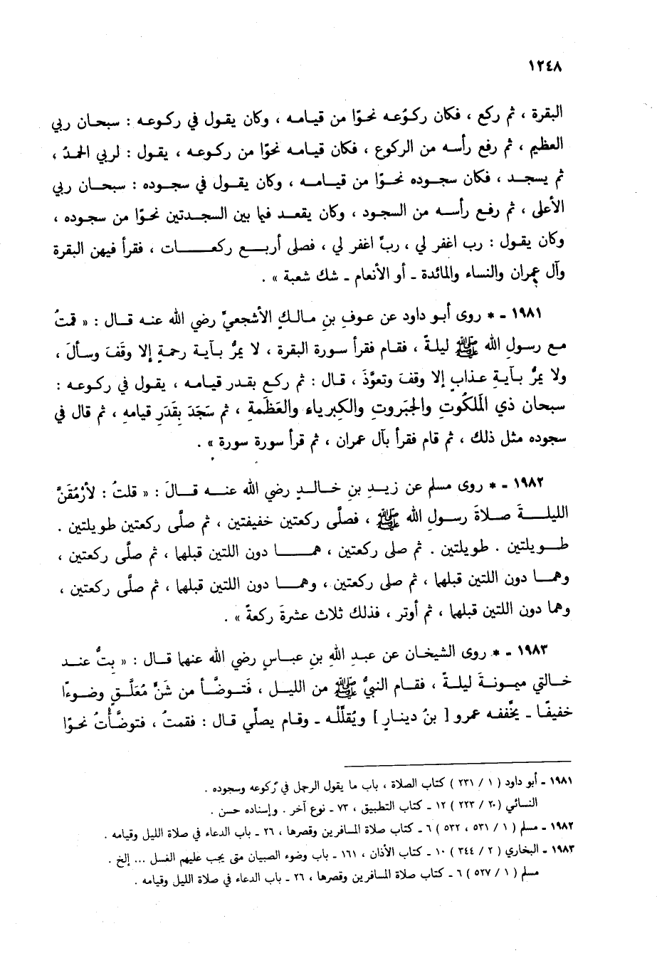 1981 - * روى أبو داود عن عوف بن مالك الأشجعي رضي الله عنه قال: "قمت مع رسول الله صلى الله عليه وسلم ليلة، فقام فقرأ سورة البقرة، لا يمر بآية رحمة إلا وقف وسأل، ولا يمر بآية عذاب إلا وقف وتعوذ، قال: ثم ركع بقدر قيامه، يقول في ركوعه: سبحان ذي الملكوت والجبروت والكبرياء والعظمة، ثم سجد بقدر قيامه، ثم قال في سجوده مثل ذلك، ثم قام فقرأ بآل عمران، ثم قرأ سورة سورة".