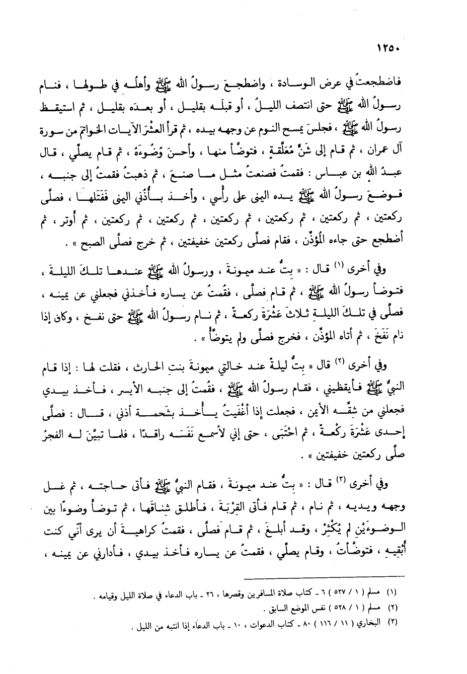 فاضطجعت في عرض الوسادة، واضطجع رسول الله صلى الله عليه وسلم وأهله في طولها، فنام رسول الله صلى الله عليه وسلم حتى انتصف الليل، أو قبله بقليل، أو بعده بقليل، ثم استيقظ رسول الله صلى الله عليه وسلم، فجلس يمسح النوم عن وجهه بيده، ثم قرأ العشر الآيات الخواتم من سورة آل عمران، ثم قام إلى شن معلقة، فتوضأ منها، وأحسن وضوءه، ثم قام يصلي، قال عبد الله بن عباس: فقمت فصنعت مثل ما صنع، ثم ذهبت فقمت إلى جنبه، فوضع رسول الله صلى الله عليه وسلم يده اليمنى على رأسي، وأخذ بأذني اليمنى ففتلها، فصلى ركعتين، ثم ركعتين، ثم ركعتين، ثم ركعتين، ثم ركعتين، ثم ركعتين، ثم أوتر، ثم أضطجع حتى جاءه المؤذن، فقام فصلى ركعتين خفيفتين، ثم خرج فصلى الصبح".