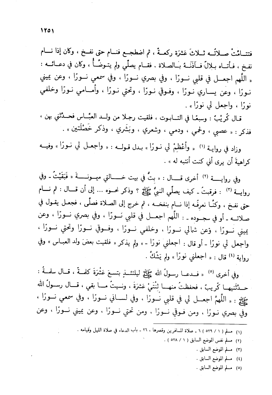 فتتامت صلاته ثلاث عشرة ركعة، ثم اضطجع فنام حتى نفخ، وكان إذا نام نفخ، فأتاه بلال فآذنه بالصلاة، فقام يصلي ولم يتوضأ، وكان في دعائه: "اللهم اجعل في قلبي نوراً، وفي بصري نوراً، وفي سمعي نوراًن وعن يميني نوراً، وعن يساري نوراً، وفوقي نوراً، وتحتي نوراً، وأمامي نوراً وخلفي نوراً، واجعل لي نوراً".