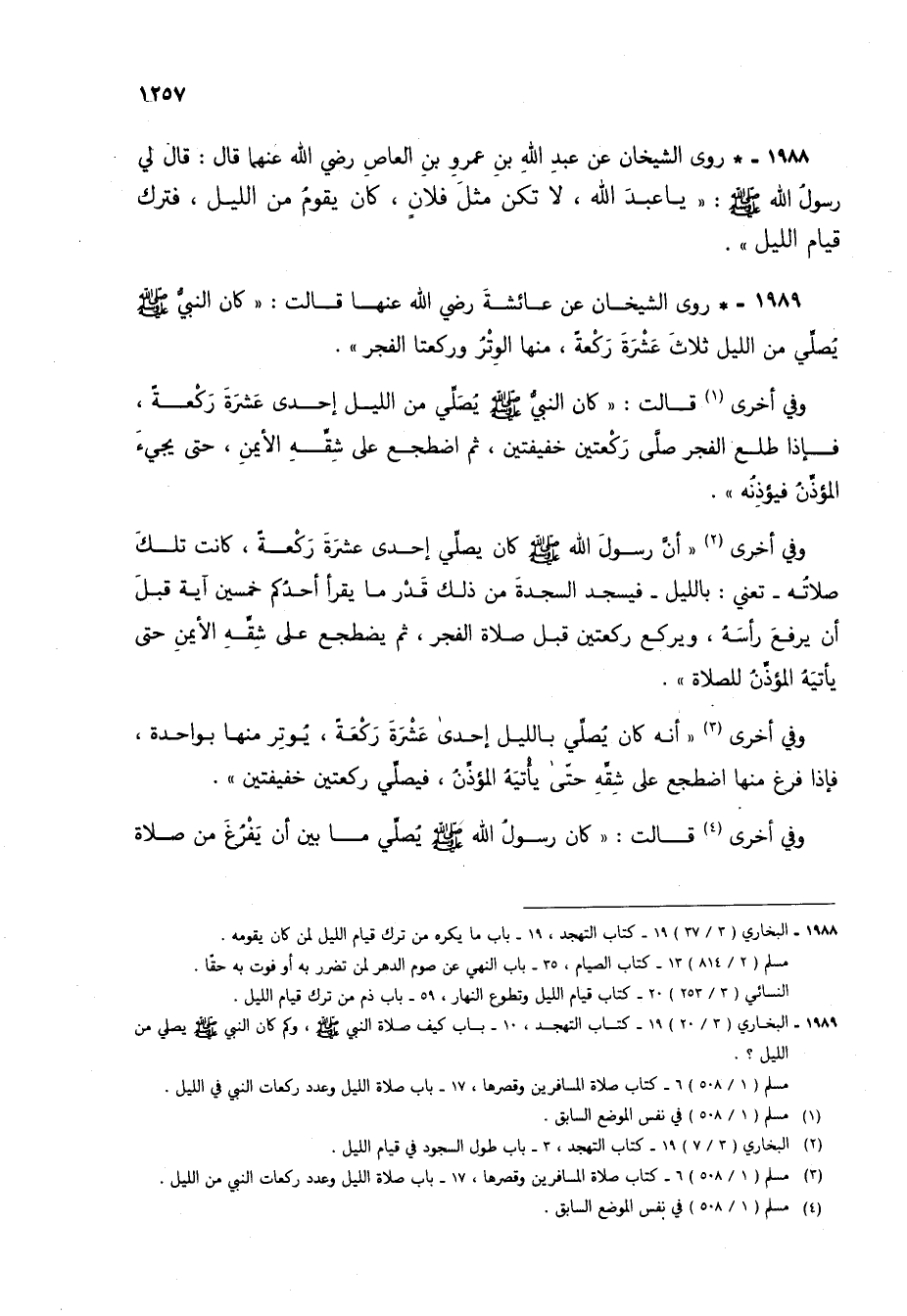 1989 - * روى الشيخان عن عائشة رضي الله عنها قالت: "كان النبي صلى الله عليه وسلم يصلي من الليل ثلاث عشرة ركعة، منها الوتر وركعتا الفجر".
