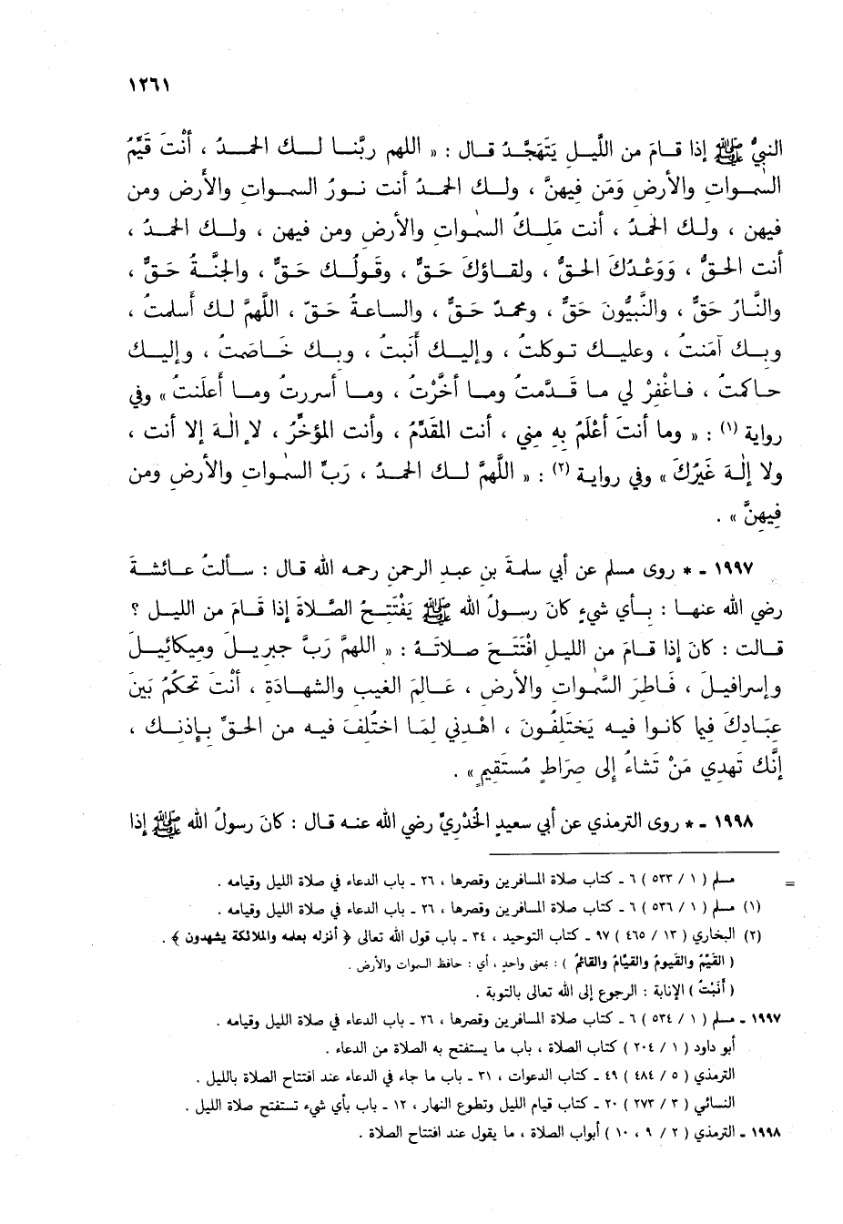 1997 - * روى مسلم عن أبي سلمة بن عبد الرحمن رحمه الله قال: سألت عائشة رضي الله عنها: بأي شيء كان رسول الله صلى الله عليه وسلم يفتتح الصلاة إذا قام من الليل؟ قالت: كان إذا قام من الليل افتتح صلاته: "اللهم رب جبريل وميكائيل وإسرافيل، فاطر السموات والأرض، عالم الغيب والشهادة، أنت تحكم بين عبادك فيما كانوا فيه يختلفون، اهدني لما اختلف فيه من الحق بإذنك، إنك تهدي من تشاء إلى صراط مستقيم".