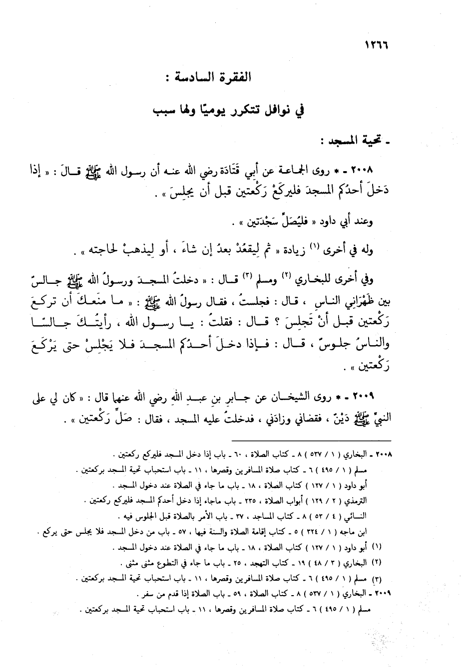 2008 - * روى الجماعة عن أبي قتادة رضي الله عنه أن رسول الله صلى الله عليه وسلم قال: "إذا دخل أحدكم المسجد فليركع ركعتين قبل أن يجلس".