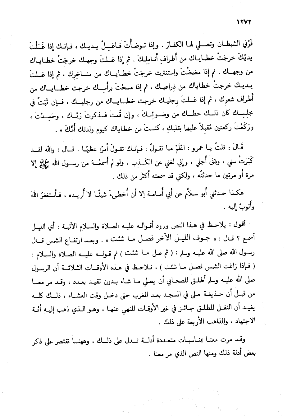 أقول: يلاحظ في هذا النص ورود أقواله عليه الصلاة والسلام الآتية: أي الليل أسمع؟ قال: "جوف الليل الآخر فصل ما شئت". وبعد ارتفاع الشمس قال رسول الله صلى الله عليه وسلم: (ثم صل ما شئت) ثم قوله عليه الصلاة والسلام: (فإذا زاغت الشمس فصل ما شئت)، نلاحظ في هذه الأوقات الثلاثة أن الرسول صلى الله عليه وسلم أطلق للصحابي أن يصلي ما شاء بدون تقيد بعدد، وقد مر معنا من قبل أن حذيفة صلى في المسجد بعد المغرب حتى دخل وقت العشاء، ذلك كله يفيد أن النفل المطلق جائز في غير الأوقات المنهي عنها، وهو الذي ذهب إليه أئمة الاجتهاد، والمذاهب الأربعة على ذلك.
