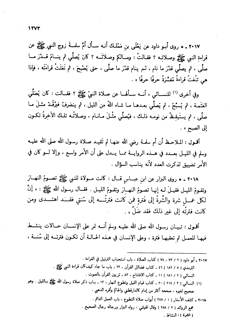 2017 - * روى أبو داود عن يعلى بن مملك أنه سأل أم سلمة زوج النبي صلى الله عليه وسلم عن قراءة النبي صلى الله عليه وسلم وصلاته؟ فقالت: وما لكم وصلاته؟ كان يصلي ثم ينام قدر ما صلى، ثم يصلي قدر ما نام، ثم ينام قدر ما صلى، حتى يصبح، ثم نعتت قراءته، فإذا هي تنعت قراءة مفسرة حرفاً حرفاً".