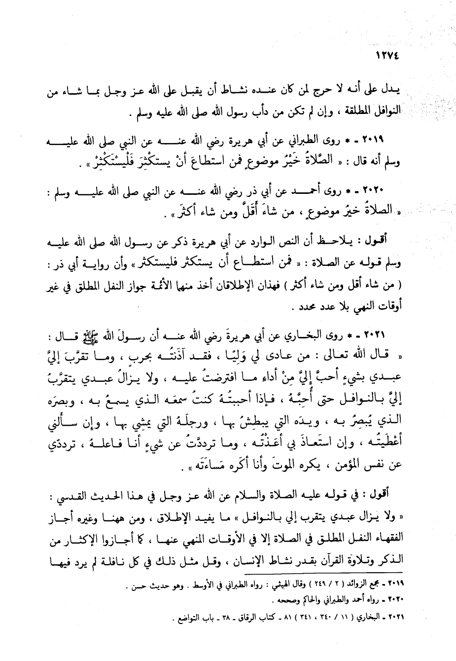 أقول: في قوله عليه الصلاة والسلام عن الله عز وجل في هذا الحديث القدسي: "ولا يزال عبدي يتقرب إلي بالنوافل" ما يفيد الإطلاق، ومن ههنا وغيره أجاز الفقهاء النفل المطلق في الصلاة إلا في الأوقات المنهي عنها، كما أجازوا الإكثار من الذكر وتلاوة القرآن بقدر نشاط الإنسان، وقل مثل ذلك في كل نافلة لم يرد فيها