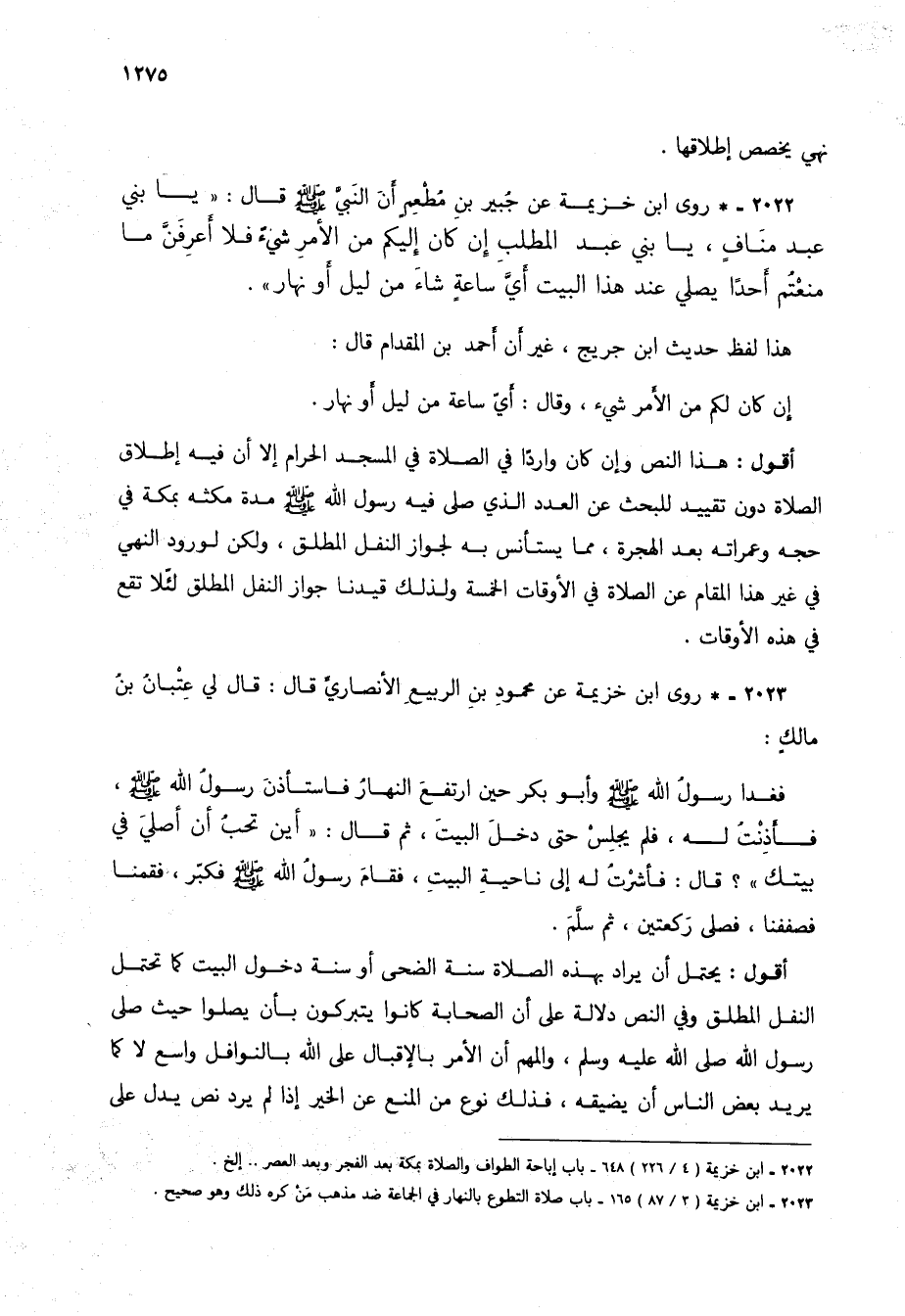 2022 - ابن خزيمة (4/ 226) 648 - باب إباحة الطواف والصلاة بمكة بعد الفجر وبعد العصر ... إلخ.