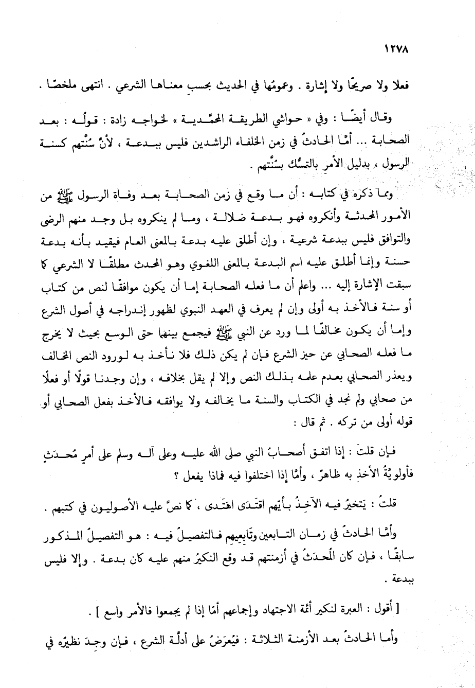 ومما ذكره في كتابه: أن ما وقع في زمن الصحابة بعد وفاة الرسول صلى الله عليه وسلم من الأمور المحدثة وأنكروه فهو بدعة ضلالة، وما لم ينكروه بل وجد منهم الرضى والتوافق فليس ببدعة شرعية، وإن أطلق عليه بدعة بالمعنى العام فيقيد بأنه بدعة حسنة وإنما أطلق عليه اسم البدعة بالمعنى اللغوي وهو المحدث مطلقاً لا الشرعي كما سبقت الإشارة إليه ... واعلم أن ما فعله الصحابة إما أن يكون موافقاً لنص من كتاب أو سنة فالأخذ به أولى وإن لم يعرف في العهد النبوي لظهور اندراجه في أصول الشرع وإما أن يكون مخالفاً لما ورد عن النبي صلى الله عليه وسلم فيجمع بينهما حتى الوسع بحيث لا يخرج ما فعله الصحابي عن حيز الشرع فإن لم يكن ذلك فلا نأخذ به لورود النص المخالف ويعذر الصحابي بعدم علمه بذلك النص وإلا لم يقل بخلافه، وإن وجدنا قولاً أو فعلاً من صحابي ولم نجد في الكتاب والسنة ما يخالفه ولا يوافقه فالأخذ بفعل الصحابي أو قوله أولى من تركه. ثم قال: