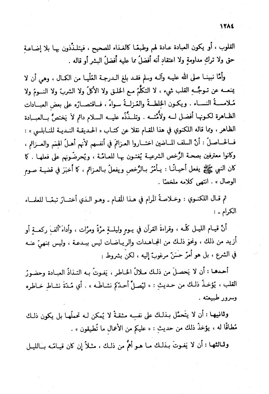 وأما نبينا صلى الله عليه وآله وسلم فقد بلغ الدرجة العليا من الكمال، وهي أن لا يمنعه عن توجه القلب شيء، لا التكلم مع الخلق ولا الأكل ولا الشرب ولا النوم ولا ملامسة النساء. ويكون الخلطة والعزلة سواء، فاقتصاره على بعض العبادات الظاهرة لكونها أفضل له ولأمته. وتلذذه عليه السلام دائم لا يختص بالعبادة الظاهر، ومما قاله اللكنوي في هذا المقام نقلاً عن كتاب "الحديقة الندية للنابلسي": فالحاصل: أن السلف الماضين اختاروا العزائم في أنفسهم لأنهم أهل الهمم والعزائم، وكانوا معترفين بصحة الرخص الشرعية يفتون بها للعامة، ويحرضونهم على فعلها. كما كان النبي صلى الله عليه وسلم يفعل أحياناً: يأمر بالرخص ويفعل بالعزائم، كما أخبر في قضية صوم الوصال". انتهى كلامه ملخصاً.
