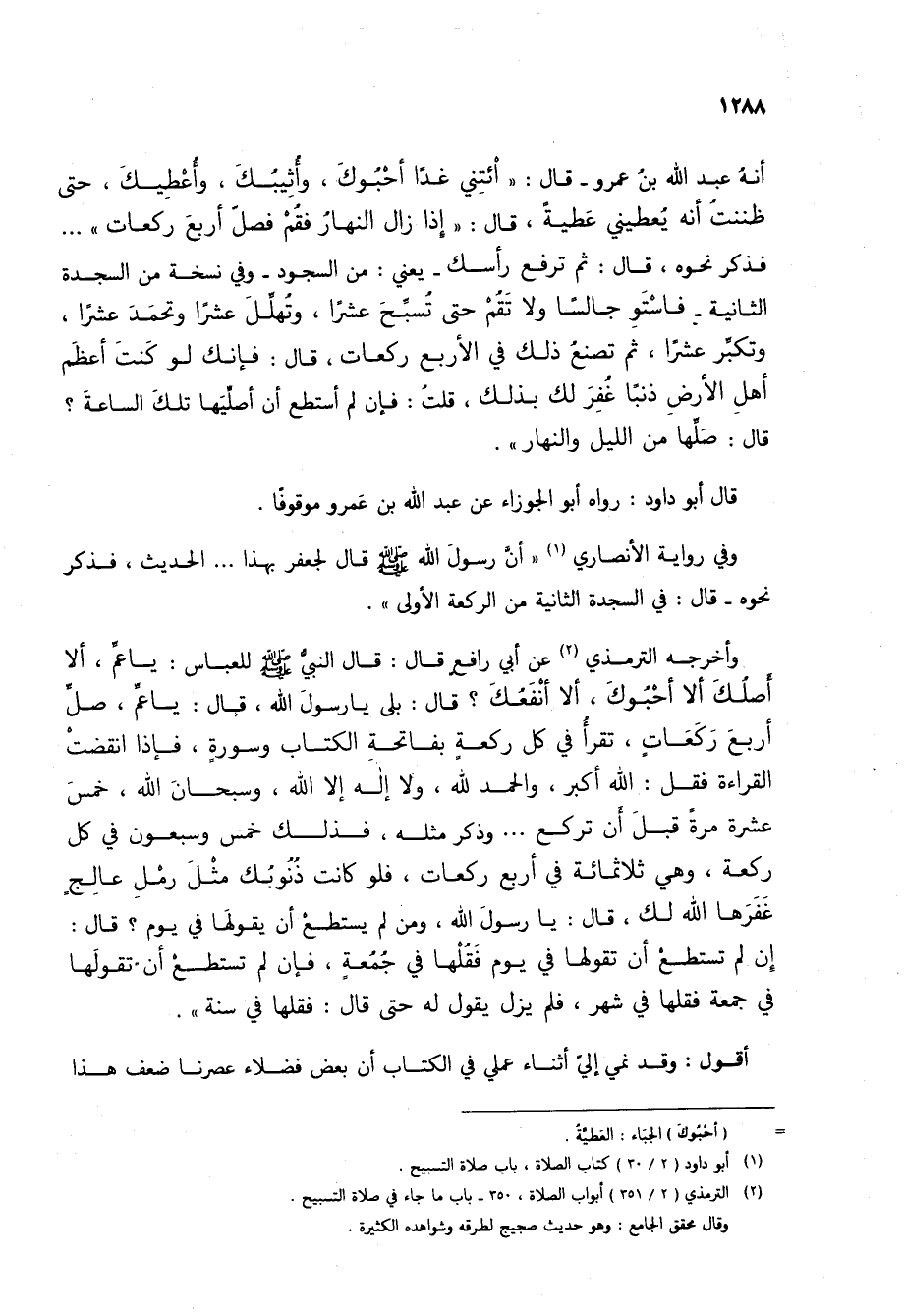 وأخرجه الترمذي (2) عن أبي رافع قال: قال النبي صلى الله عليه وسلم للعباس: يا عم، ألا أصلك ألا أحبوك، ألا أنفعك؟ قال: بلى يا رسول الله، قال: يا عم، صل أربع ركعات، تقرأ في كل ركعة بفاتحة الكتاب وسورة، فإذا انقضت القراءة فقل: الله أكبر، والحمد لله، ولا إله إلا الله، وسبحان الله، خمس عشرة مرة قبل أن تركع ... وذكر مثله، فذلك خمس وسبعون في كل ركعة، وهي ثلاثمائة في أربع ركعات، فلو كانت ذنوبك مثل رمل عالج غفرها الله لك، قال: يا رسول الله، ومن لم يستطع أن يقولها في يوم؟ قال: إن لم تستطع أن تقولها في يوم فقلها في جمعة، فإن لم تستطع أن تقولها في جمعة فقلها في شهر، فلم يزل يقول له حتى قال: فقلها في سنة".