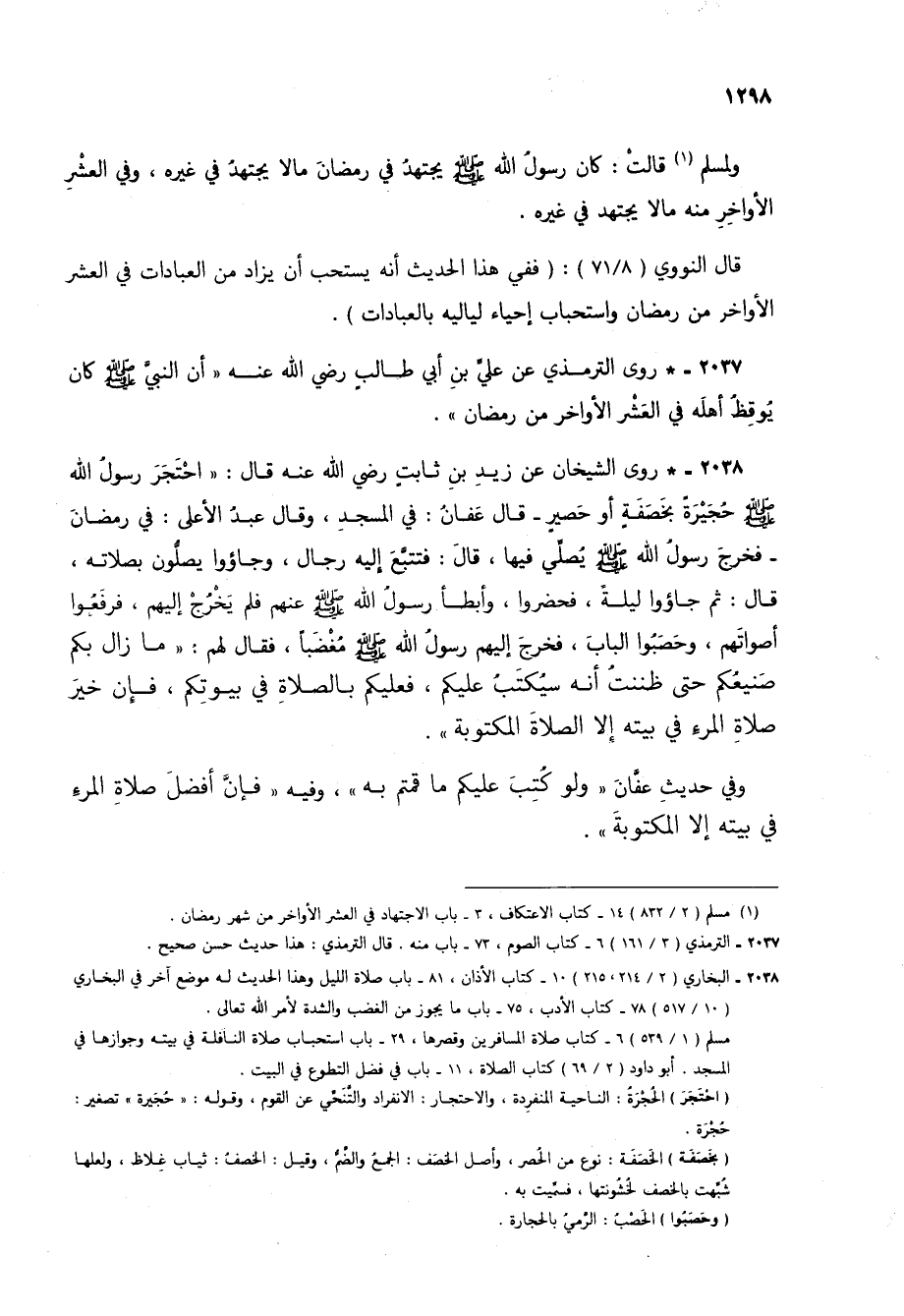 2038 - * روى الشيخان عن زيد بن ثابت رضي الله عنه قال: احتجر رسول الله صلى الله عليه وسلم حجيرة بخصفة أو حصير- قال عفان: في المسجد، وقال عبد الأعلى: في رمضان- فخرج رسول الله صلى الله عليه وسلم يصلي فيها، قال: فتتبع إليه رجال، وجاؤوا يصلون بصلاته، قال: ثم جاؤوا ليلة، فحضروا، وأبطأ برسول الله صلى الله عليه وسلم عنهم فلم يخرج إليهم، فرفعوا أصواتهم، وحصبوا الباب، فخرج إليهم رسول الله صلى الله عليه وسلم مغضباً، فقال لهم: "ما زال بكم صنيعكم حتى ظننت أنه سيُكتب عليكم، فعليكم بالصلاة في بيوتكم، فإن خير صلاة المرء في بيته إلا الصلاة المكتوبة".