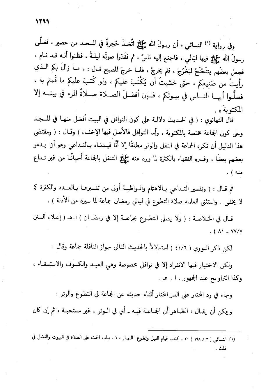 قال التهانوي: (في الحديث دلالة على كون النوافل في البيت أفضل منها في المسجد وعلى كون الجماعة مختصة بالمكتوبة، وأما النوافل فالأصل فيها الإخفاء) وقال: (ومقتضى هذا الدليل أن تكره الجماعة في النفل والوتر مطلقاً إلا أنا قيدناه بالتداعي وهو أن يدعو بعضهم بعضاً، وفسره الفقهاء بالكثرة لما ورد عنه صلى الله عليه وسلم التنفل بالجماعة أحياناً من غير تداع منه).