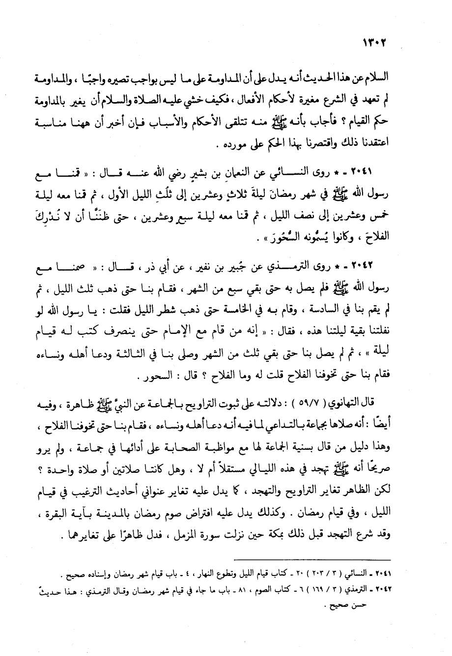 2041 - * روى النسائي عن النعمان بن بشير رضي الله عنه قال: "قمنا مع رسول الله صلى الله عليه وسلم في شهر رمضان ليلة ثلاث وعشرين إلى ثلث الليل الأول، ثم قمنا معه ليلة خمس وعشرين إلى نصف الليل، ثم قمنا معه ليلة سبع وعشرين، حتى ظننا أن لا ندرك الفلاح، وكانوا يسمونه السحور".