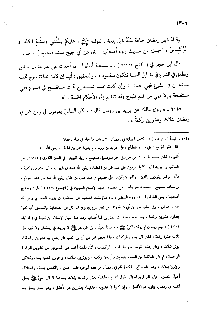 وقيام شهر رمضان جماعة سُنة غير بدعة، لقوله صلى الله عليه وسلم "عليكم بسنتي وسنة الخلفاء الراشدين" [جزء من حديث رواه أصحاب السنن عن أبي نجيح بسند صحيح]. اهـ.