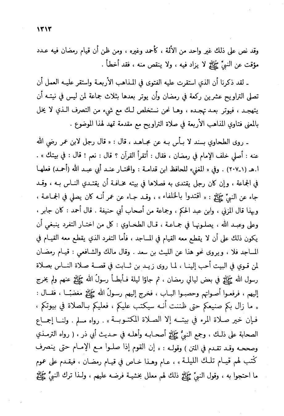 - روى الطحاوي بسند لا بأس به عن مجاهد، قال: "قال رجل لابن عمر رضي الله عنه: أصلي خلف الإمام في رمضان، فقال: أتقرأ القرآن؟ قال: نعم! قال: في بيتك". ا. هـ (1 - 207). وفي "المغني" للحافظ ابن قدامة: والمختار عند أبي عبد الله (أحمد) فعلها في الجماعة، وإن كان رجل يقتدى به فصلاها في بيته مخافة أن يقتدي الناس به، وقد جاء عن النبي صلى الله عليه وسلم: "اقتدوا بالخلفاء"، وقد جاء عن عمر أنه كان يصلي في الجماعة، وبهذا قال المزني، وابن عبد الحكم، وجماعة من أصحاب أبي حنيفة. قال أحمد: كان جابر، وعلي وعبد الله، يصلونها في جماعة، قال الطحاوي: كل من اختار التفرد ينبغي أن يكون ذلك على أن لا يقطع معه القيام في المساجد، فأما التفرد الذي يقطع معه القيام في المساجد فلا، ويروى نحو هذا عن الليث بن سعد. وقال مالك والشافعي: قيام رمضان لمن قوي في البيت أحب إلينا، لما روى زيد بن ثابت في قصة صلاة الناس بصلاة رسول الله صلى الله عليه وسلم في بعض ليالي رمضان، ثم جاؤوا ليلة فأبطأ رسول الله صلى الله عليه وسلم عنهم ولم يخرج إليهم، فرفعوا أصواتهم وحصبوا الباب، فخرج إليهم رسول الله صلى الله عليه وسلم مغضباً، فقال: "ما زال بكم صنيعكم حتى ظننت أنه سيكتب عليكم، فعليكم بالصلاة في بيوتكم، فإن خير صلاة المرء في بيته إلا الصلاة المكتوبة". رواه مسلم. ولنا إجماع الصحابة على ذلك، وجمع النبي صلى الله عليه وسلم أصحابه وأهله في حديث أبي ذر، (رواه الترمذي وصححه وقد تقدم في المتن) وقوله: "إن القوم إذا صلوا مع الإمام حتى ينصرف كتب لهم قيام تلك الليلة"، عام وهذا خاص في قيام رمضان، فيقدم على عموم ما احتجوا به، وقول النبي صلى الله عليه وسلم ذلك لهم معلل بخشية فرضه عليهم، ولذا ترك النبي صلى الله عليه وسلم