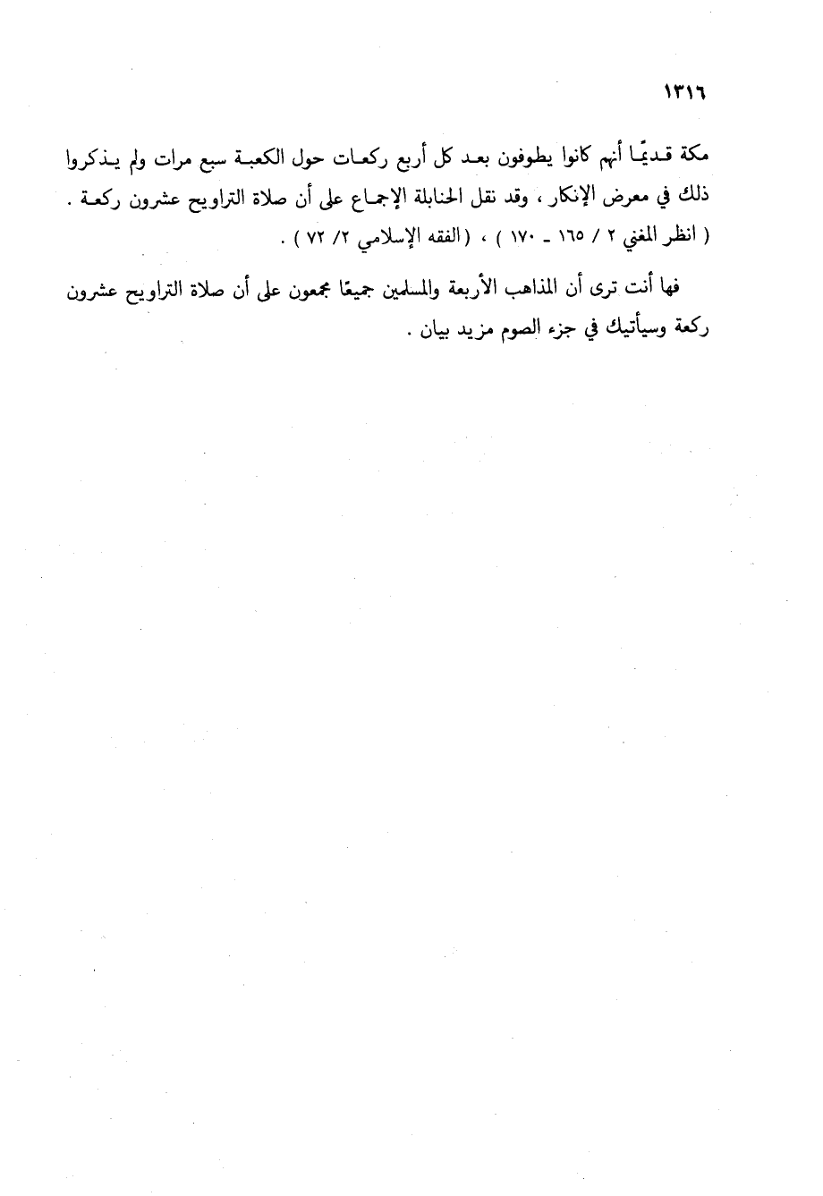 مكة قديماً أنهم كانوا يطوفون بعد كل أربع ركعات حول الكعبة سبع مرات ولم يذكروا ذلك في معرض الإنكار، وقد نقل الحنابلة الإجماع على أن صلاة التراويح عشرون ركعة. (انظر المغني 2/ 165 - 170)، (الفقه الإسلامي 2/ 72).