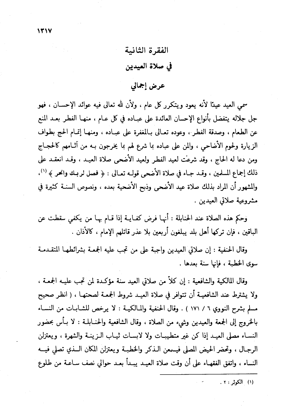 وقال المالكية والشافعية: إن كلاً من صلاتي العيد سنة مؤكدة لمن تجب عليه الجمعة، ولا يشترط عند الشافعية أن تتوافر في صلاة العيد شروط الجمعة لصحتها، (انظر صحيح مسلم بشرح النووي 6/ 171). وقال الحنفية والمالكية: لا يرخص للشابات من النساء بالخروج إلى الجمعة والعيدين وشيء من الصلاة، وقال الشافعية والحنابلة: لا بأس بحضور النساء مصلى العيد إذا كن غير متطيبات ولا لابسات ثياب الزينة والشهرة، ويعتزلن الرجال، وتحضر الحيض المصلى فيسمعن الذكر والخطبة ويعتزلن المكان الذي تصلي فيه النساء، واتفق الفقهاء على أن وقت صلاة العيد يبدأ بعد حوالي نصف ساعة من طلوع