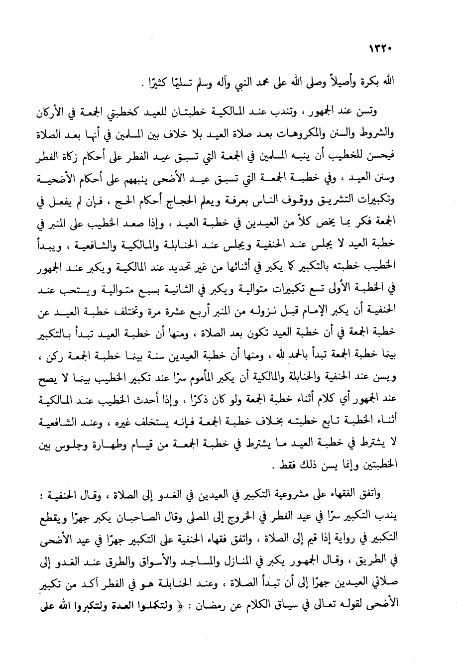 وتسن عند الجمهور، وتندب عند المالكية خطبتان للعيد كخطبتي الجمعة في الأركان والشروط والسنن والمكروهات بعد صلاة العيد بلا خلاف بين المسلمين في أنها بعد الصلاة فيحسن للخطيب أن ينبه المسلمين في الجمعة التي تسبق عيد الفطر على أحكام زكاة الفطر وسنن العيد، وفي خطبة الجمعة التي تسبق عيد الأضحى ينبههم على أحكام الأضحية وتكبيرات التشريق ووقوف الناس بعرفة ويعلم الحجاج أحكام الحج، فإن لم يفعل في الجمعة فكر بما يخص كلاً من العيدين في خطبة العيد، وإذا صعد الخطيب على المنبر في خطبة العيد لا يجلس عند الحنفية ويجلس عند الحنابلة والمالكية والشافعية، ويبدأ الخطيب خطبته بالتكبير كما يكبر في أثنائها من غير تحديد عند المالكية ويكبر عند الجمهور في الخطبة الأولى تسع تكبيرات متوالية ويكبر في الثانية بسبع متوالية ويستحب عند الحنفية أن يكبر الإمام قبل نزوله من المنبر أربع عشرة مرة وتختلف خطبة العيد عن خطبة الجمعة في أن خطبة العيد تكون بعد الصلاة، ومنها أن خطبة العيد تبدأ بالتكبير بينما خطبة الجمعة تبدأ بالحمد لله، ومنها أن خطبة العيدين سنة بينما خطبة الجمعة ركن، ويسن عند الحنفية والحنابلة والمالكية أن يكبر المأموم سراً عند تكبير الخطيب بينما لا يصح عند الجمهور أي كلام أثناء خطبة الجمعة ولو كان ذكراً، وإذا أحدث الخطيب عند المالكية أثناء الخطبة تابع خطبته بخلاف خطبة الجمعة فإنه يستخلف غيره، وعند الشافية لا يشترط في خطبة العيد ما يشترط في خطبة الجمعة من قيام وطهارة وجلوس بين الخطبتين وإنما يسن ذلك فقط.