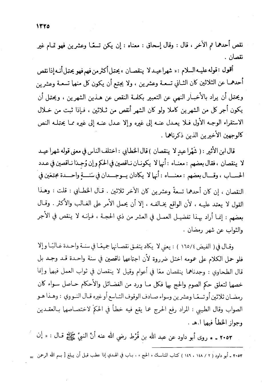 قال ابن الأثير: (شهرا عيد لا ينقصان) قال الخطابي: اختلف الناس في معنى قوله شهرا عيد لا ينقصان، فقال بعضهم: معناه: أنهما لا يكونان ناقصين في الحكم وإن وُجدا ناقصين في عدد الحساب، وقال بعضهم: معناه: أنهما لا يكادان يوجدان في سنة واحدة مجتمعين في النقصان، إن كان أحدهما تسعة وعشرين كان الآخر ثلاثين. قال الخطابي: قلت: وهذا القول لا يعتمد عليه، لأن الواقع يخالفه، إلا أن يحمل الأمر على الغالب والأكثر. وقال بعضهم: إنما أراد بهذا تفضيل العمل في العشر من ذي الحجة، فإنه لا ينقص في الأجر والثواب عن شهر رمضان.