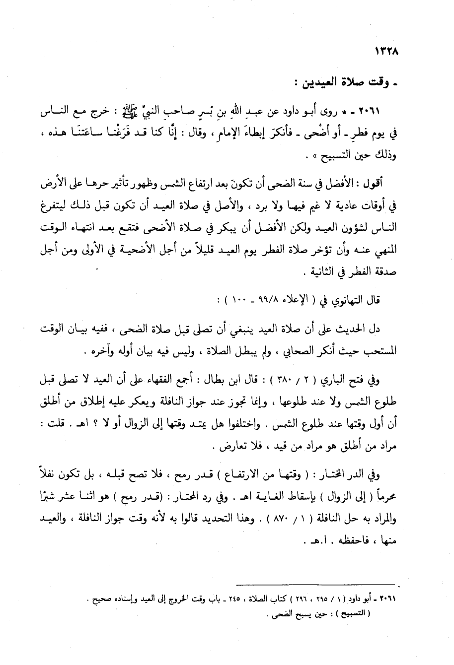 2061 - * روى أبو داود عن عبد الله بن بسر صاحب النبي صلى الله عليه وسلم: خرج مع الناس في يوم فطر- أو أضحى- فأنكر إبطاء الإمام، وقال: إنا كنا قد فرغنا ساعتنا هذه، وذلك حين التسبيح".